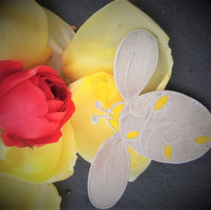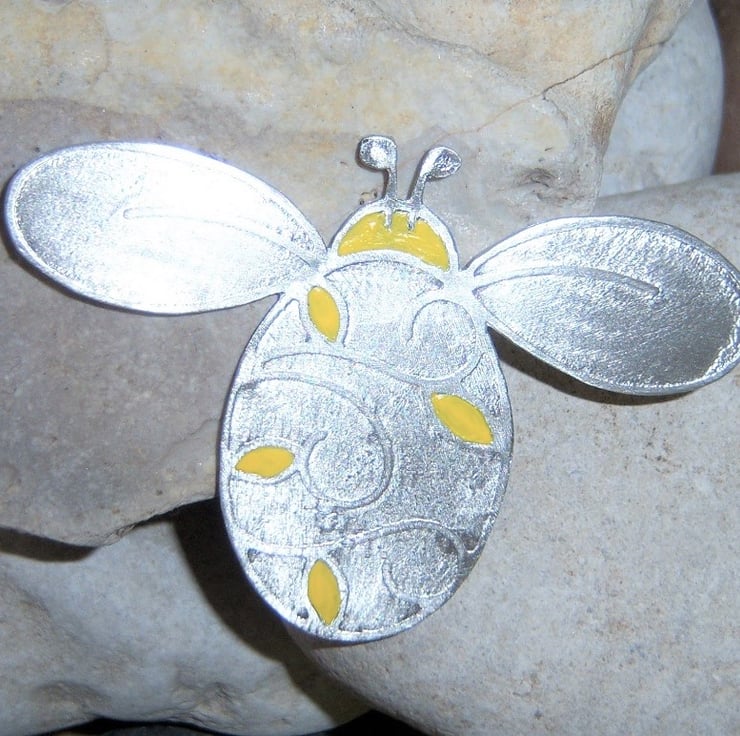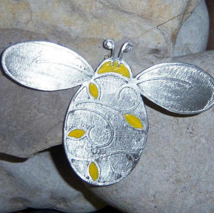 Large bee brooch made from sheet pewter. I have etched it, cut-out and then added a little yellow glass paint to add a few highlights. 5cms long and 7cms wingtip to wingtip. Sterling silver brooch fastener attached.
