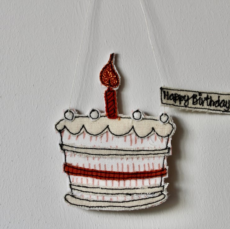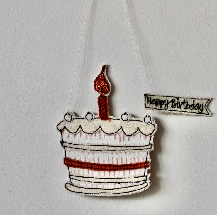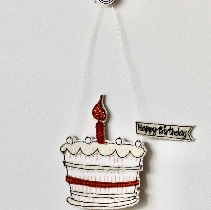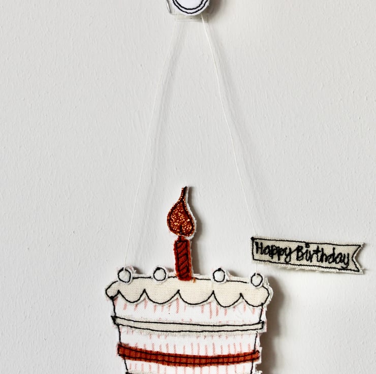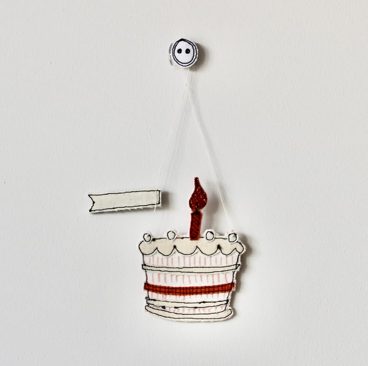 Birthday Cake is created using free hand machine embroidery, line printed cotton cloth, glitter cloth and a cream linen string to hang. Multiple layers of cloth are sewn together and cut out by hand, using a very sharp pair of scissors