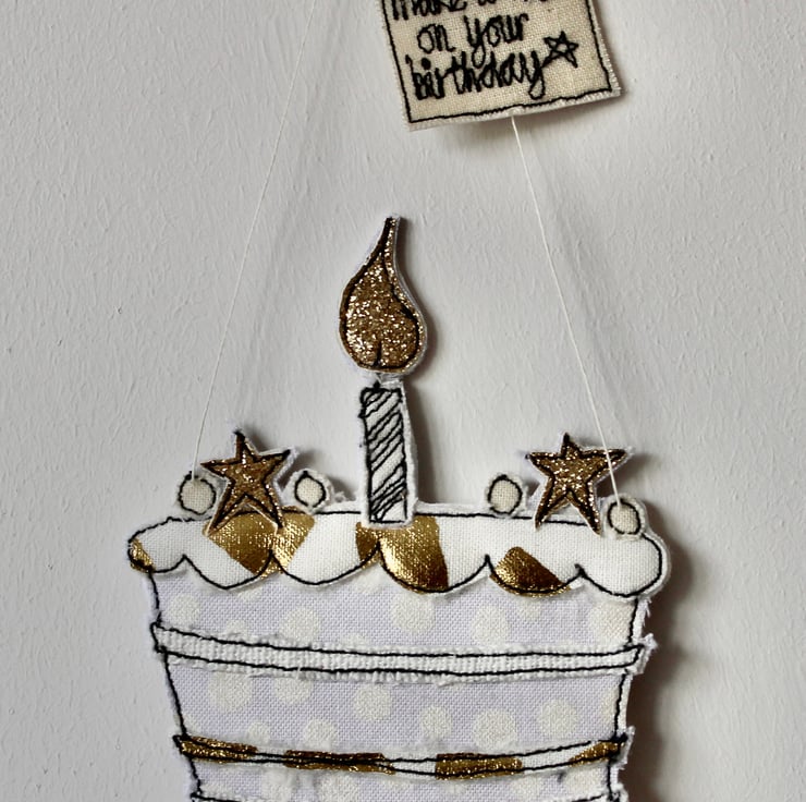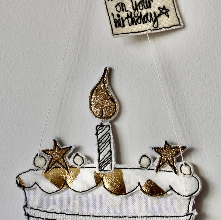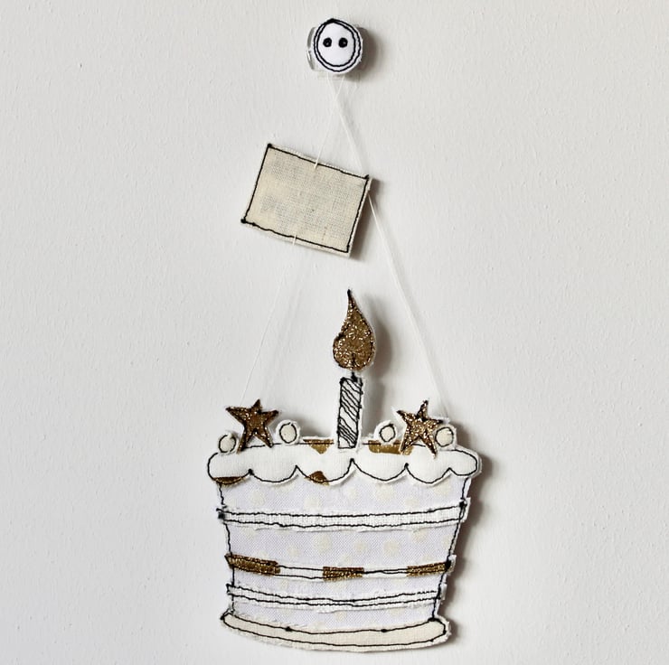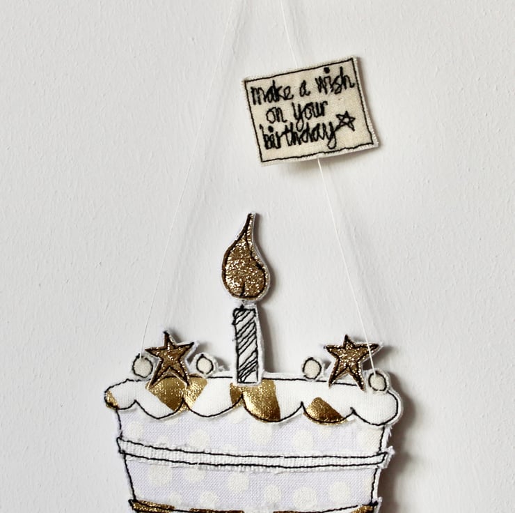 Birthday Cake is created using free hand machine embroidery, dotty printed cotton cloth, glitter cloth and a cream linen string to hang. Multiple layers of cloth are sewn together and cut out by hand, using a very sharp pair of scissors