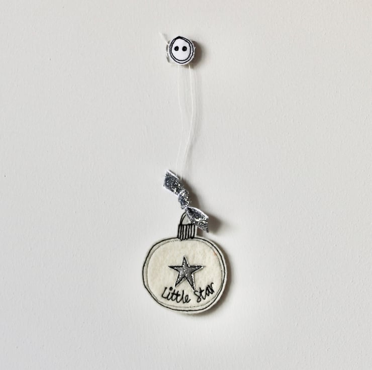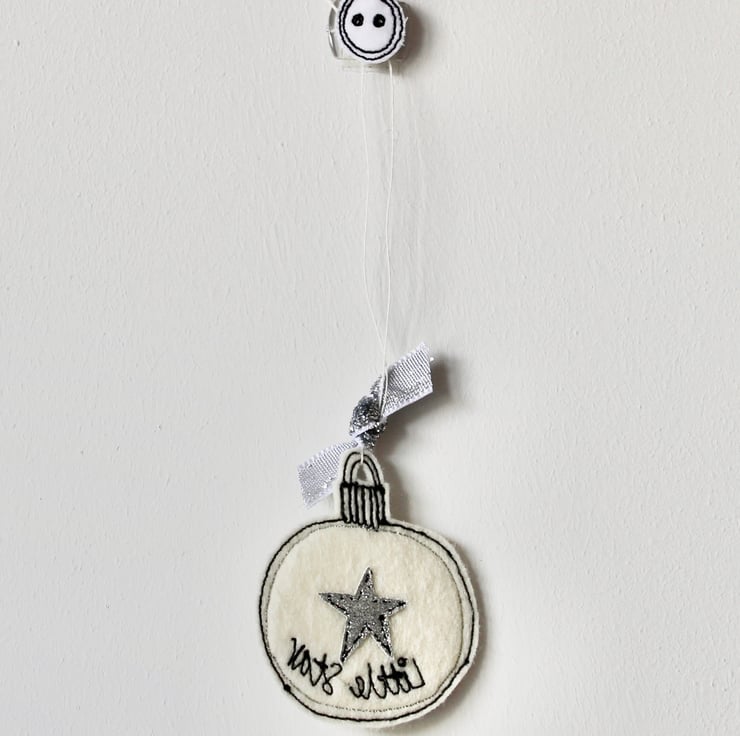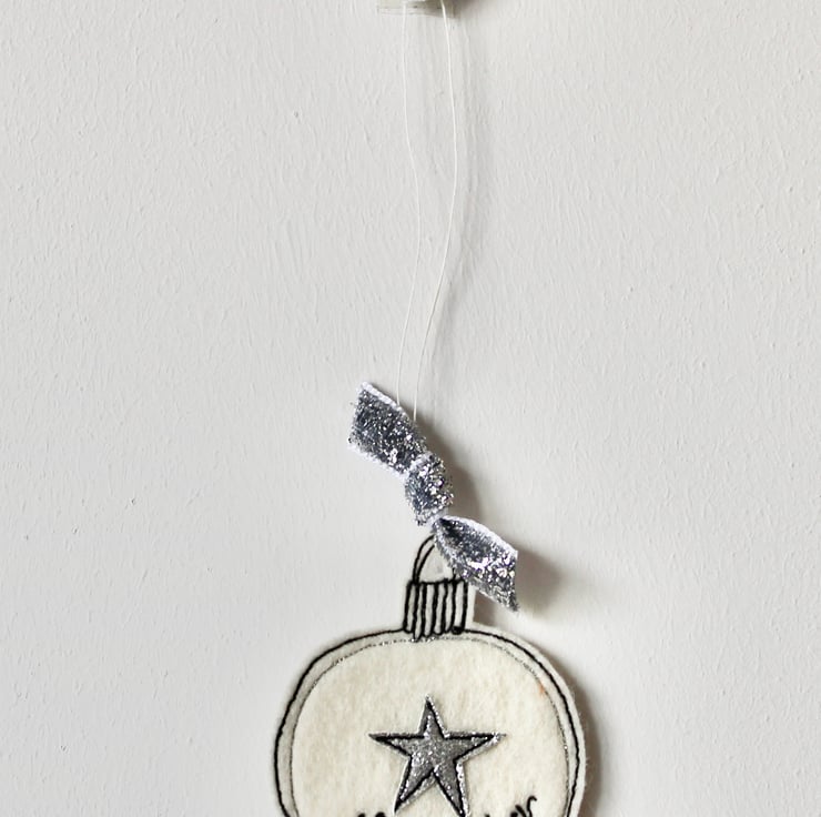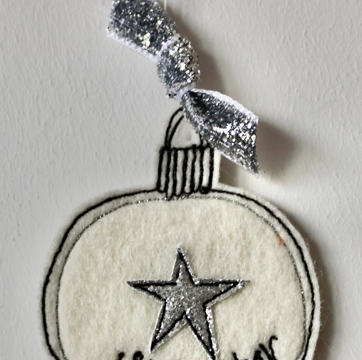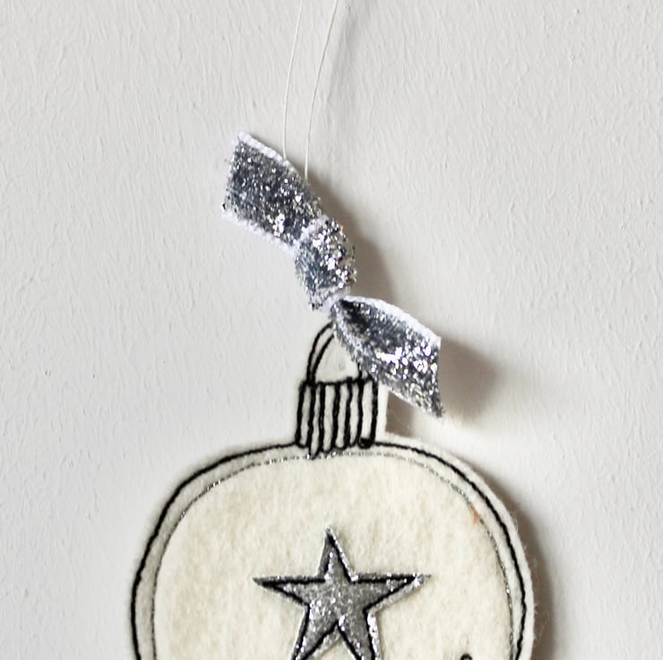 Wool felt baubles are created using 100% cream wool felt, glitter cloth, glittery ribbon, free hand machine embroidery and cut out by hand, using a very sharp pair of scissors. Suspend using the linen thread to make a stylish statement.