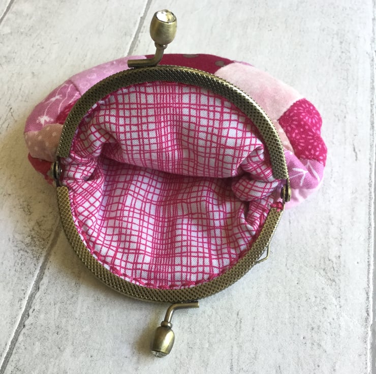 The bronze coloured metal clasp has an embossed pattern of swirls, flowers and dots and is attached to the purse with a deep pink embroidery thread. The clasp has two sparkly stones set in them.