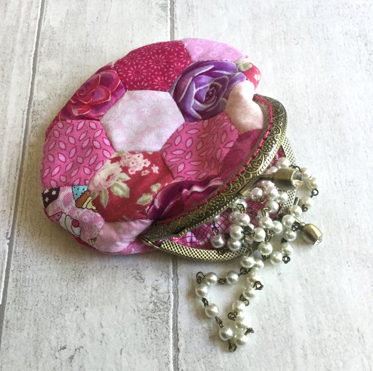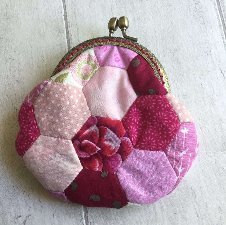 This delightful little purse would be perfect to hold all kinds of treasures and not just coins and notes. I have used the English paper piecing technique to hand stitch the hexagons together to form this little clasp purse in cotton fabrics in a variety of designs and shades of pink and purple.