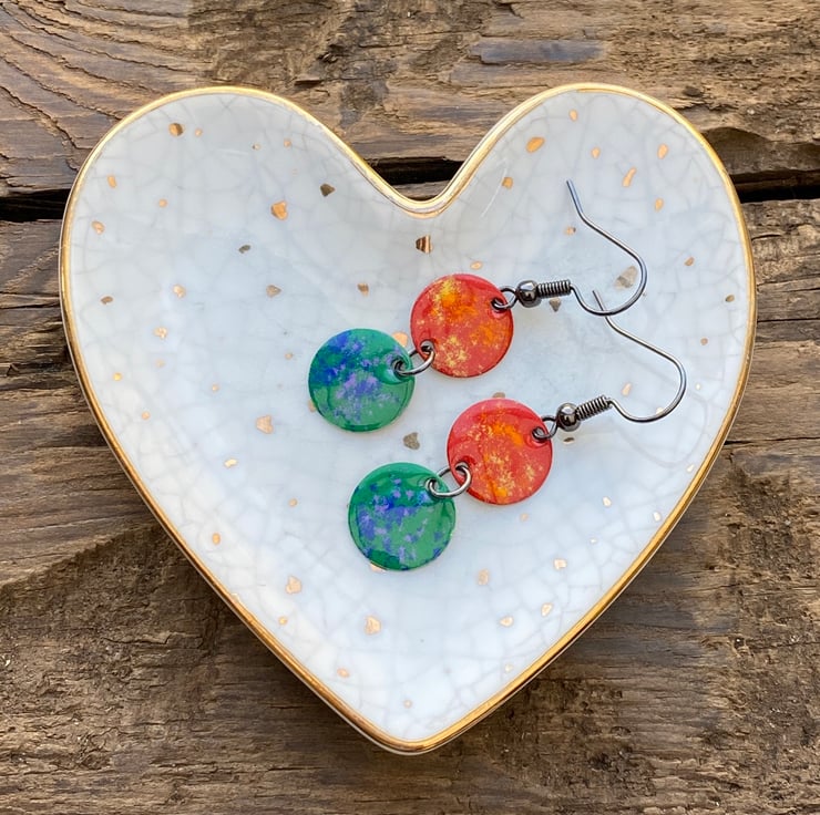 The top of this duo has been started with a base layer of red and splattered with orange and yellow. The bottom has a base layer of green and splattered with blue and purple. A completely unique pair of earrings and an alternative to the usual rainbow.