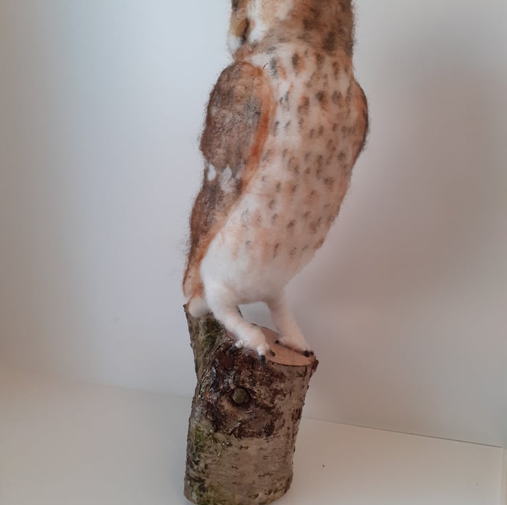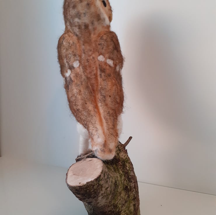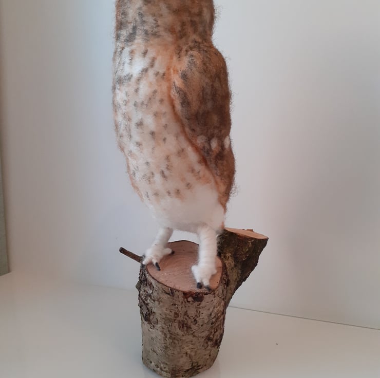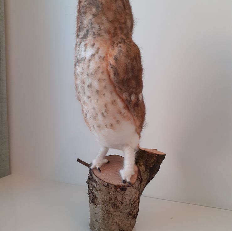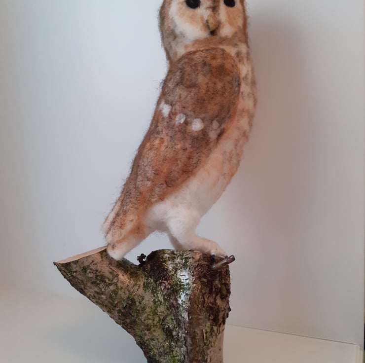 All wool,needle felted on a wire armature which is secured to a wood log.