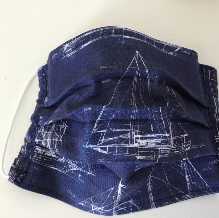 Double layered fabric face mask made in a nautical design from Robert Kaufman fabrics.