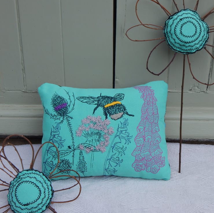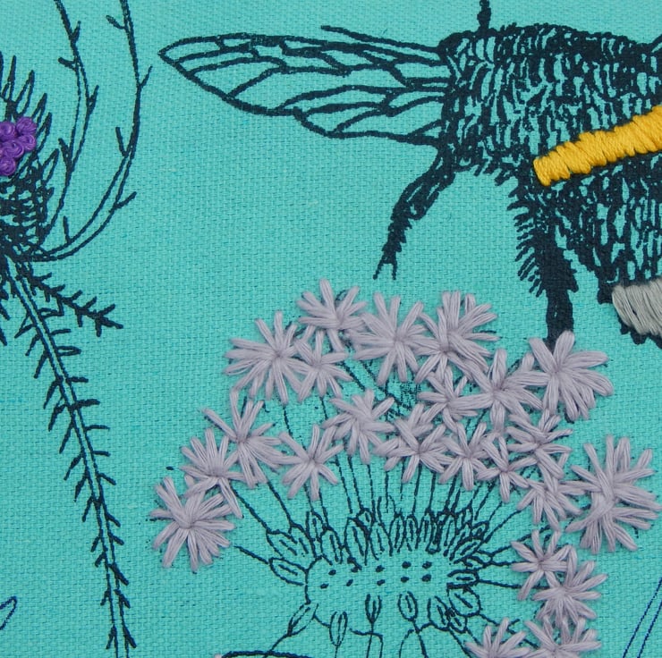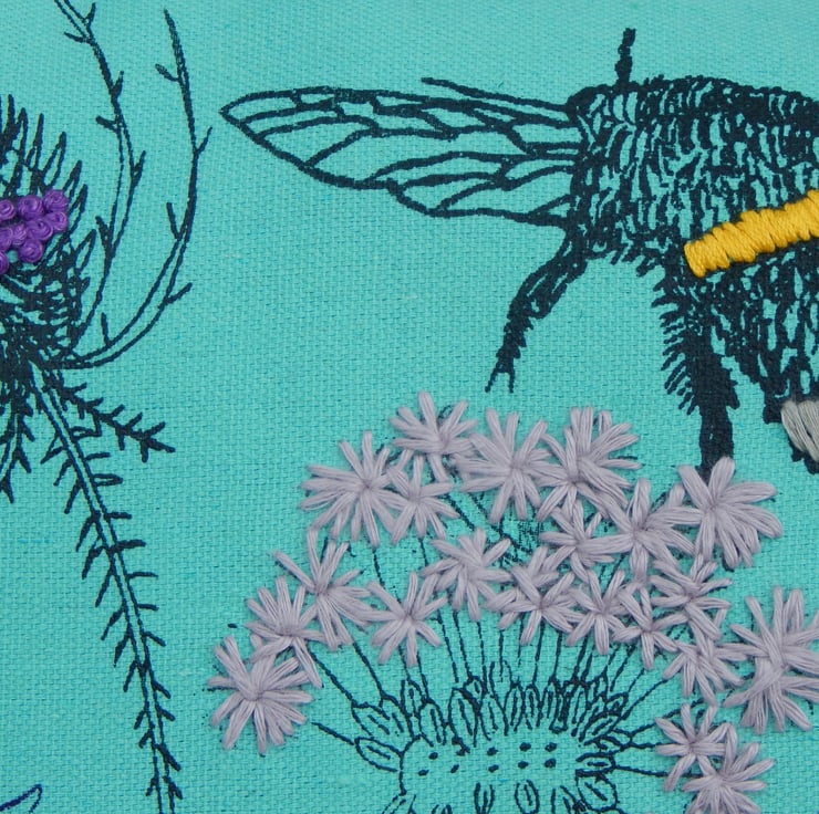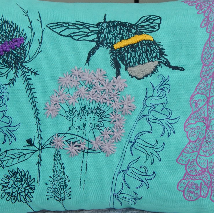 There is a bumble bee in flight with its bands hand embroidered in yellow and light grey. There is a foxglove, dandelion clock, bluebell, teasel, scabious and plantain. The teasel and dandelion clock have hand embroidery to make them pop with colour.