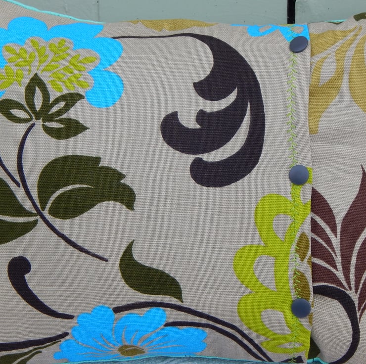 This is a bright turquoise cotton canvas cushion that I have made with a floral upholstery type fabric on the reverse, it is an envelope style with poppers. The cushion measures 33cm by 25cm.
