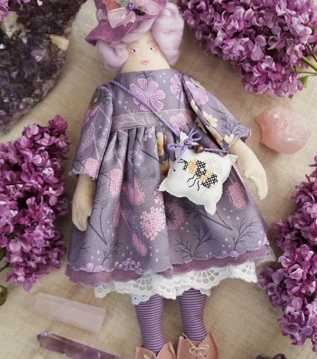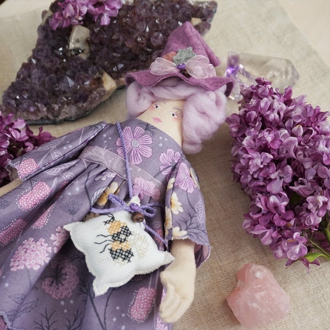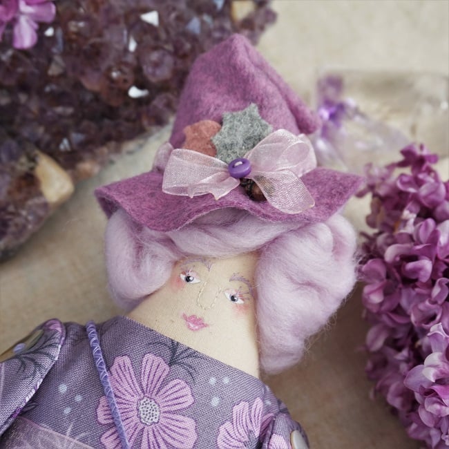 If you come from Lancashire and you make dolls, well you are going to make a witch doll. I love my little witch dolls, they are not remotely wicked just sweet hedge witches that are kind and gentle. Syrin is a lilac witch with a bumble bee on her sachet xx