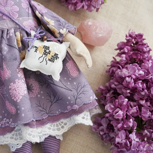 She is dressed in a Lewis and Irene fabric Botanic Garden, rich lilacs with flowers of pale pink and yellow. Her outfit is completed with tiny buttons, leather shoes and a little bumblebee on her sachet to pollinate all those flowers. She has coordinating knickers and underskirts in cotton and lace.