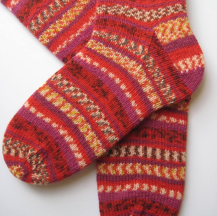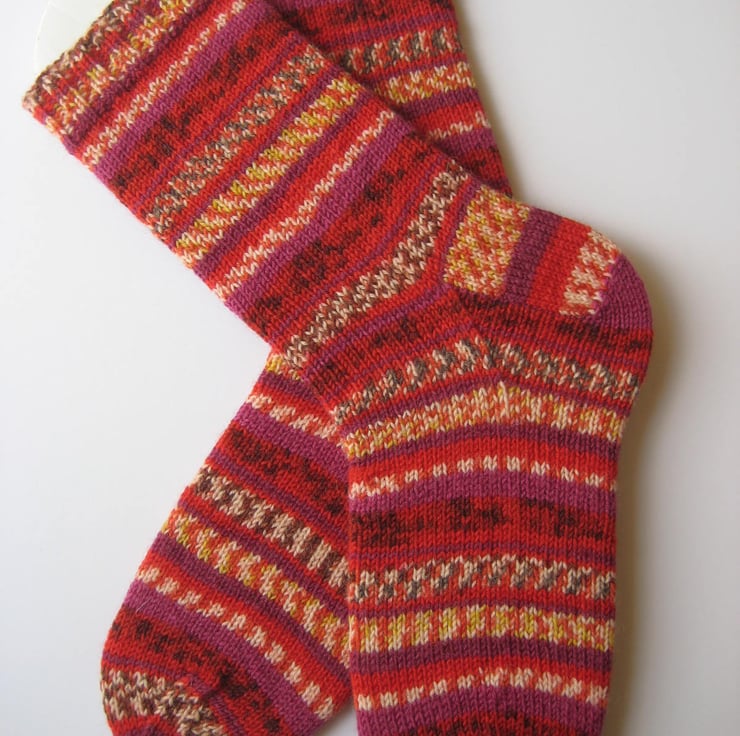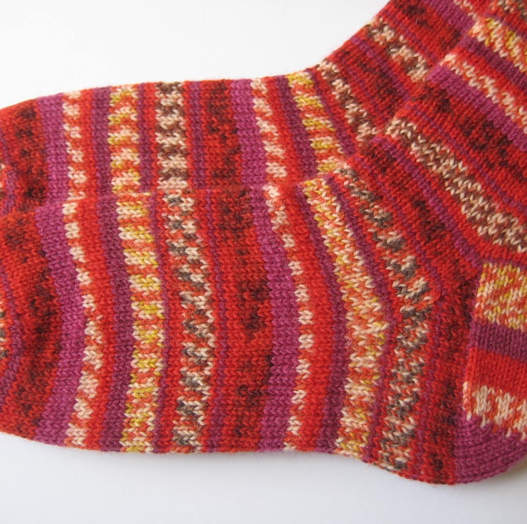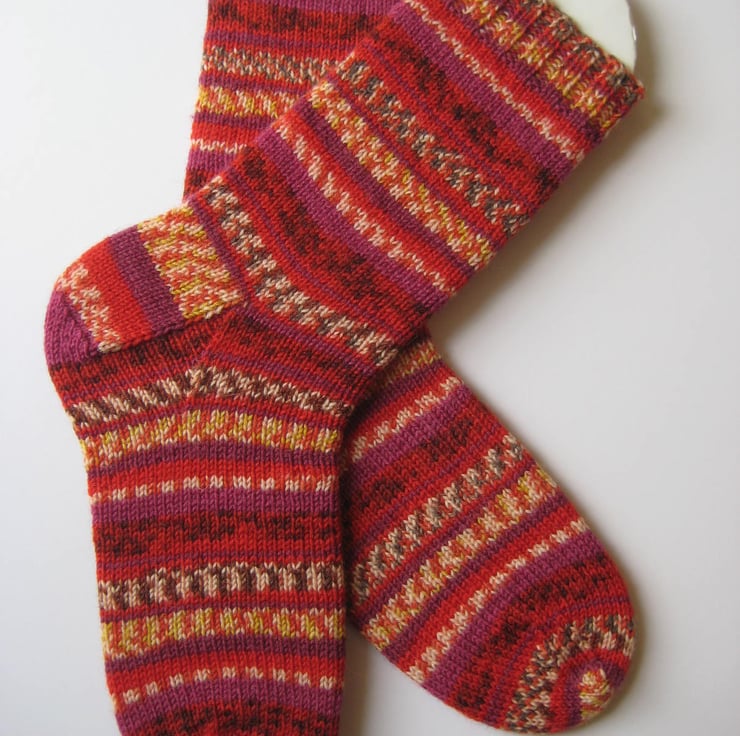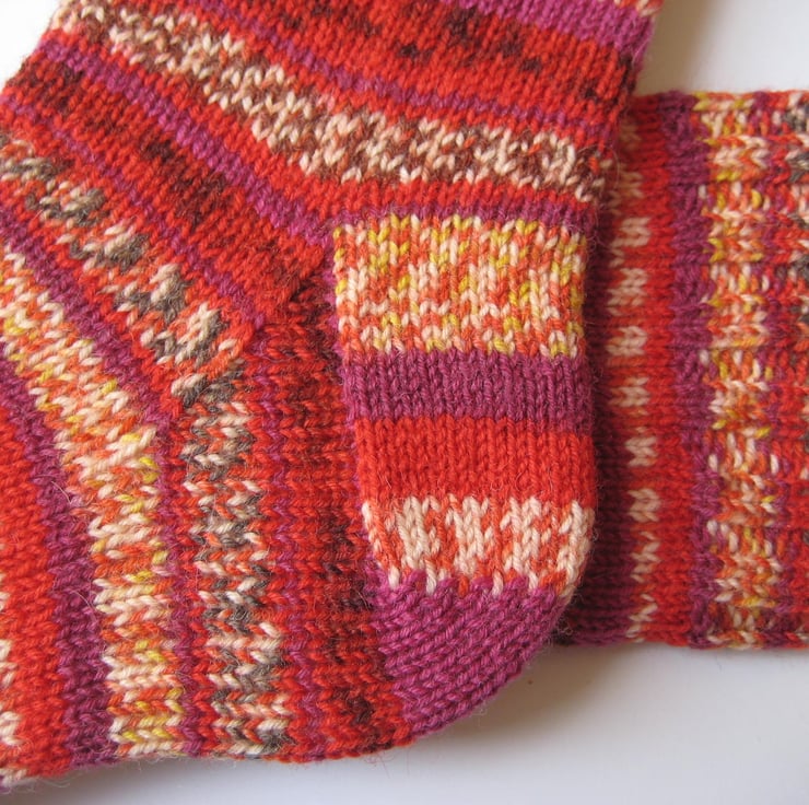Hand knitted in the round on 5 double pointed needles, these wool socks are made from Regia 4 ply self patterning sock yarn (75% wool 25% polyamide) in shades of red, purple, orange, yellow and cream. Made from very fine yarn, they are not thick and will fit most footwear. Warm and durable, these socks will keep your feet comfortable and bright throughout the year. A truly unique pair of socks that will cheer up any feet!
