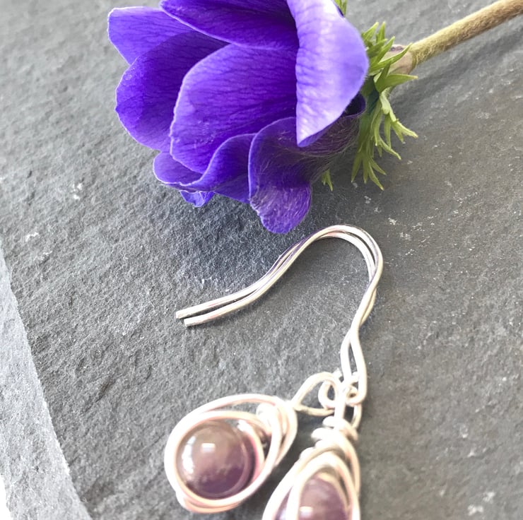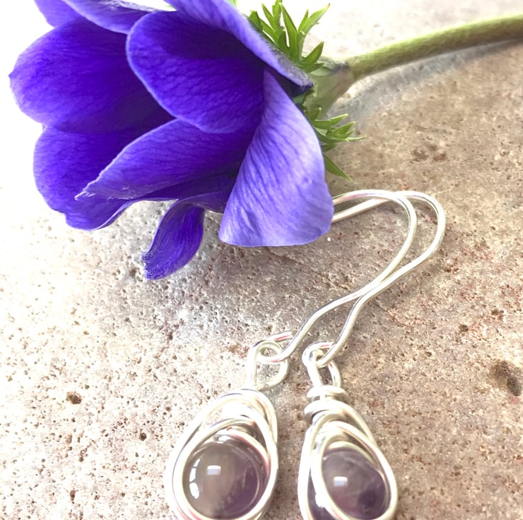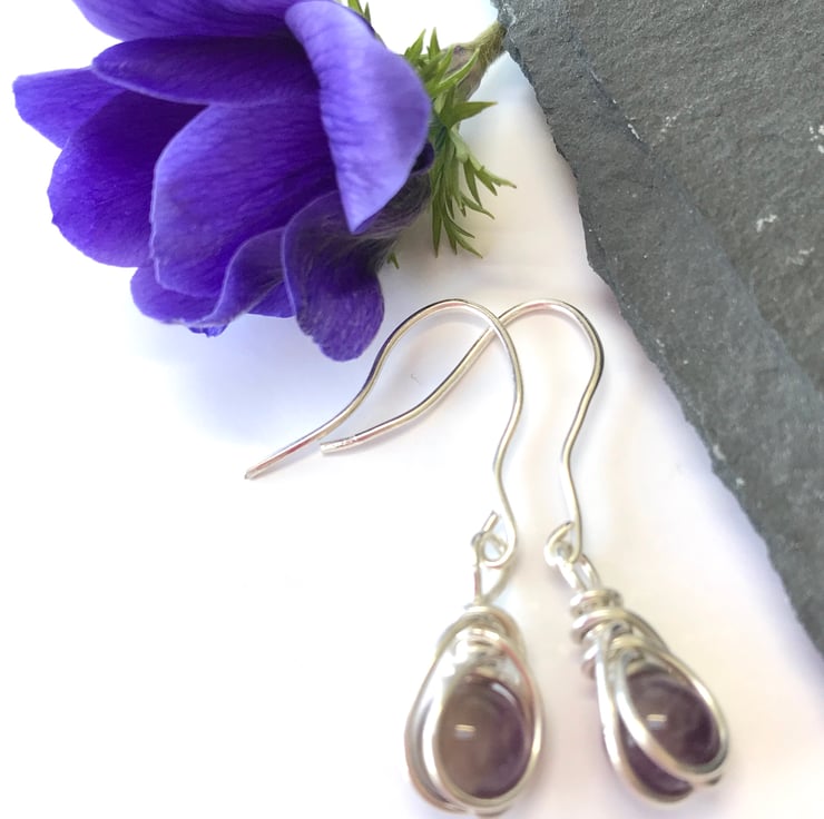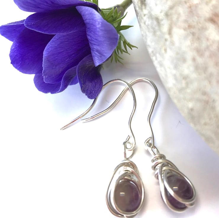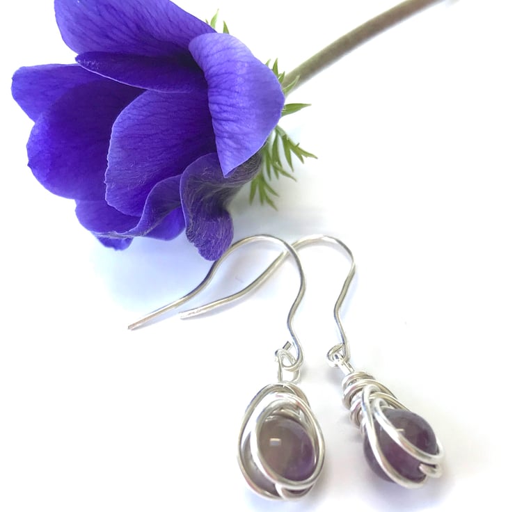 These pretty earrings have been created from sterling silver wire, using a herringbone wire wrapping technique and deep purple amethyst gemstone beads. They have hand crafted sterling silver fittings.