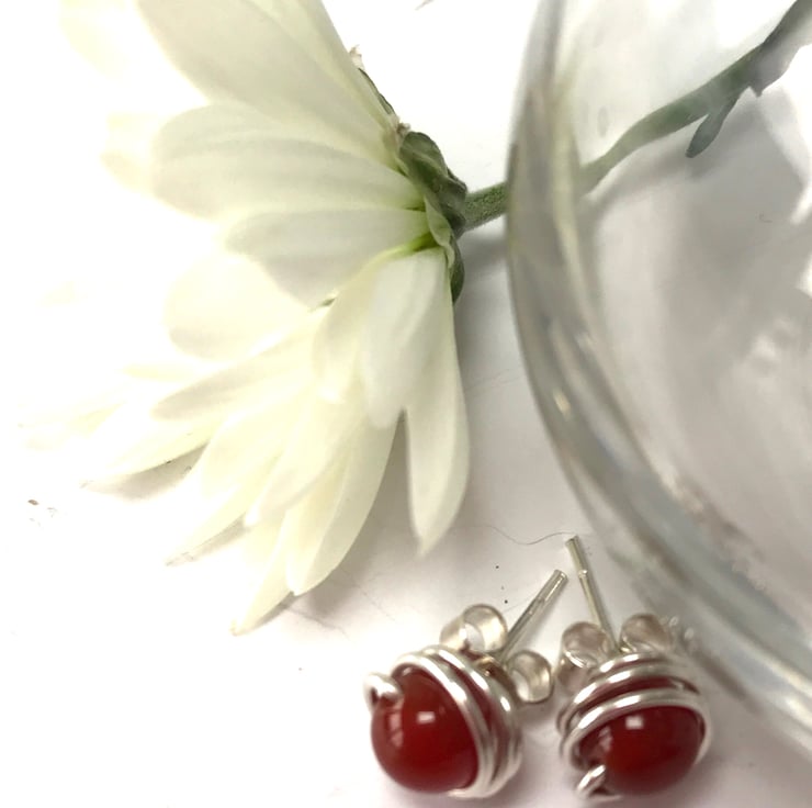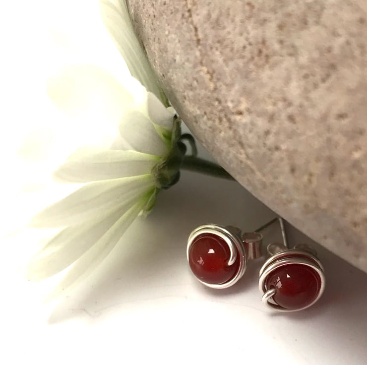 These pretty stud earrings have been created using sterling silver wire with red Carnelian gemstones and silver scroll fittings. See my shop for matching bracelet.