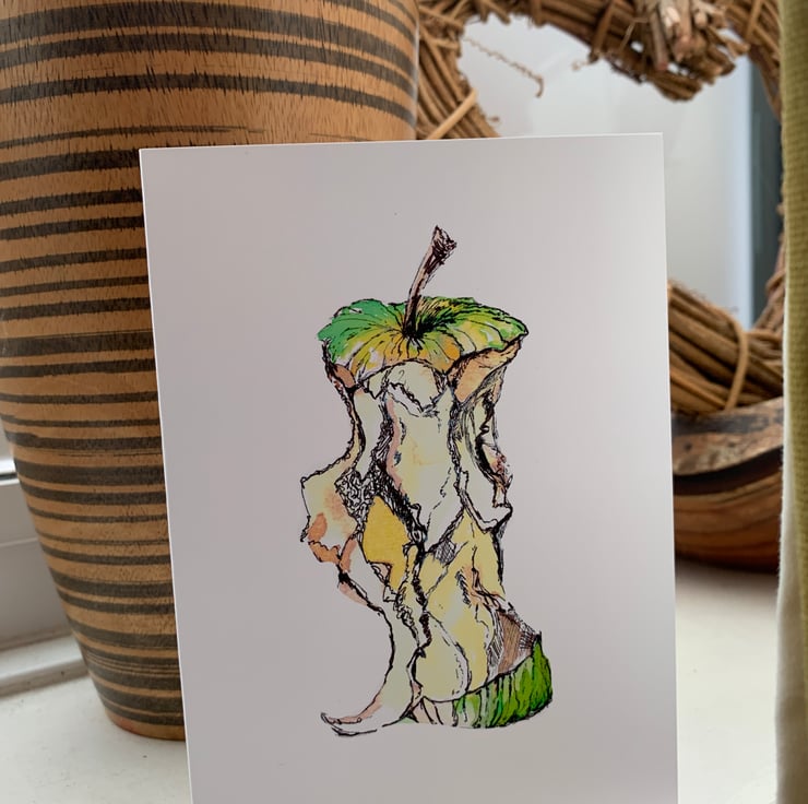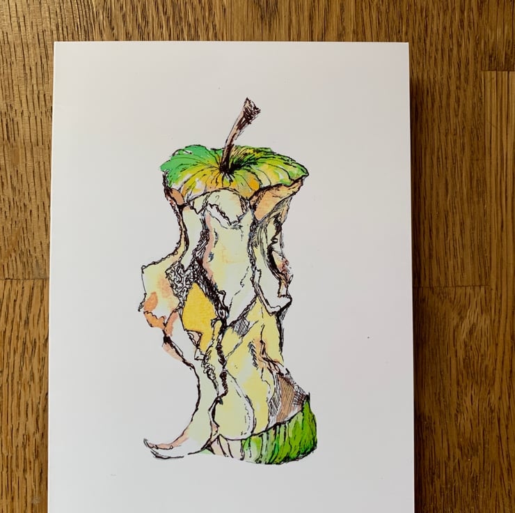 Pen and ink drawing of apple core reprinted onto A6 card, with brown envelope