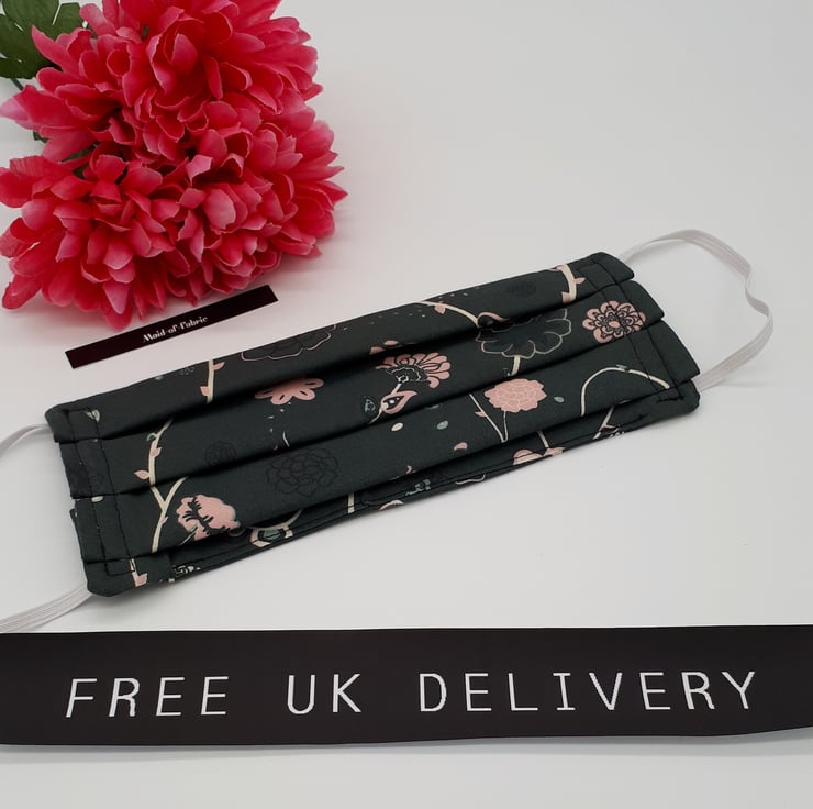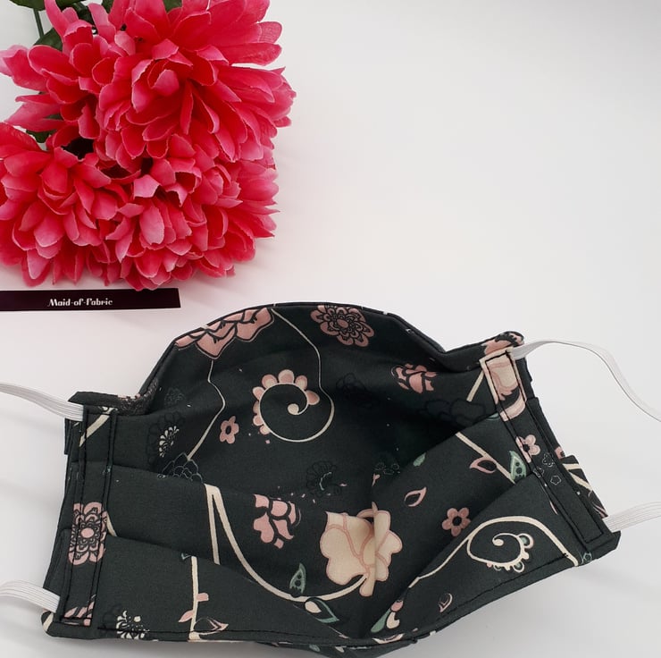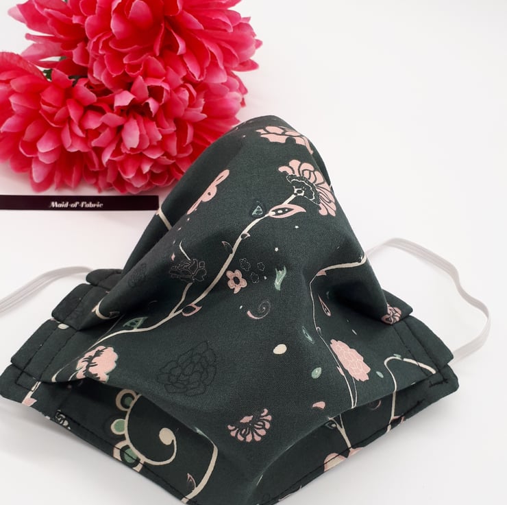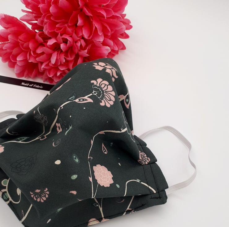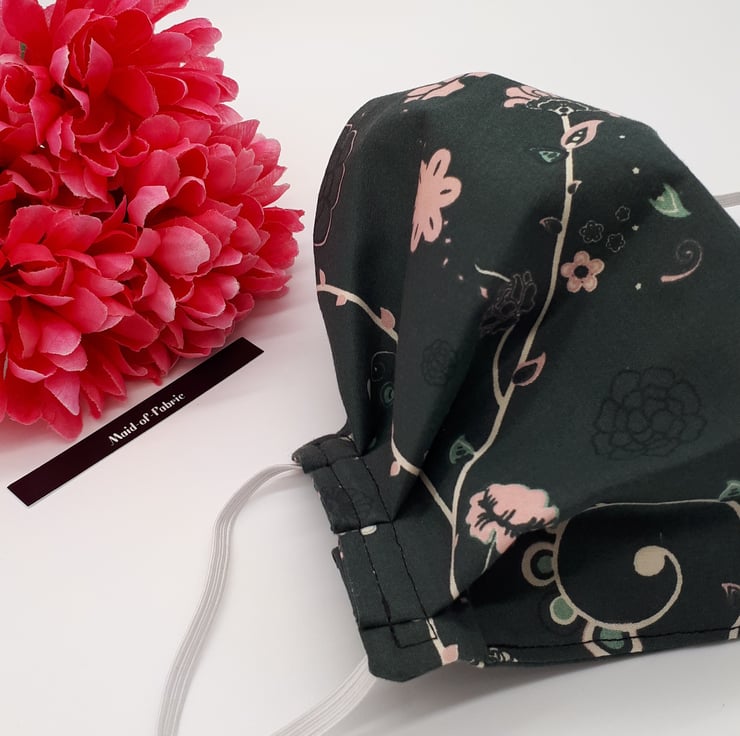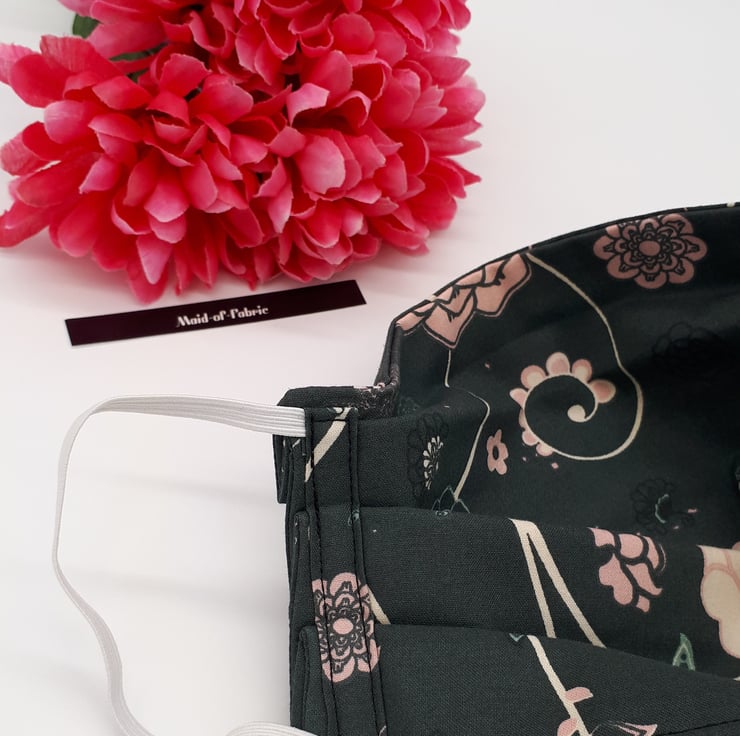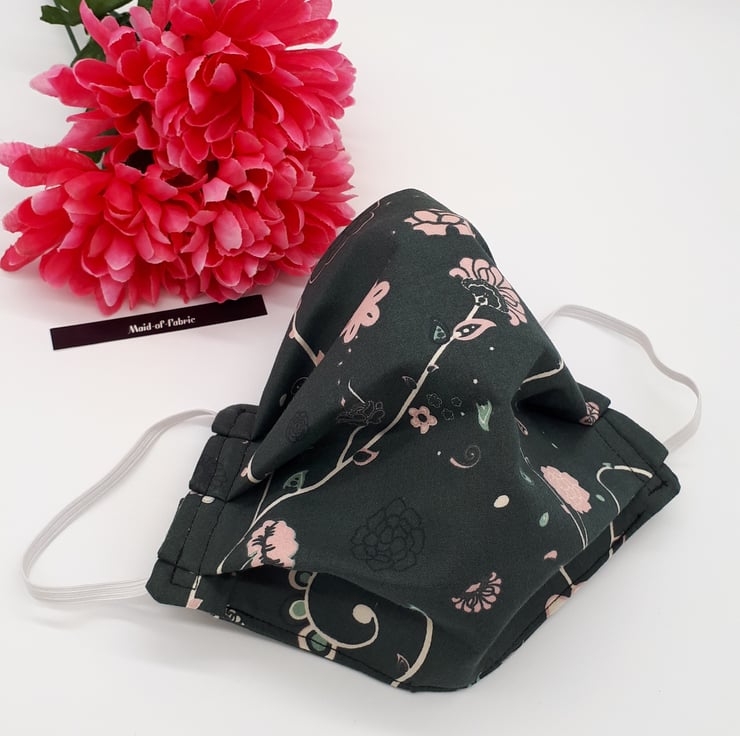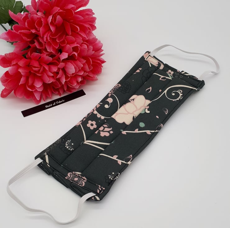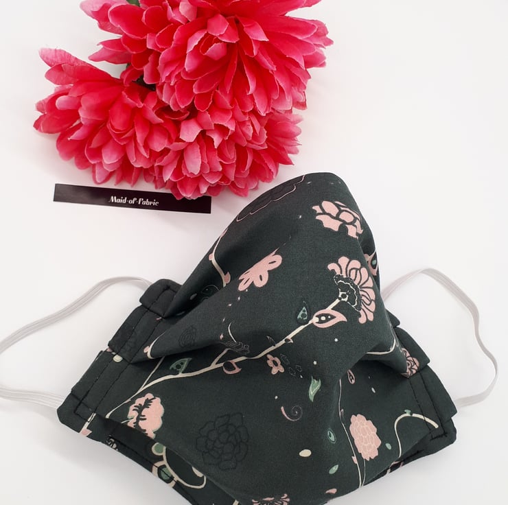 The mask measures 9" across the face, 3.5" in depth when folded and 9" in depth when expanded. The elastic loops measure 6.5" and can be tied to make the mask smaller.