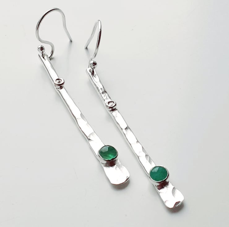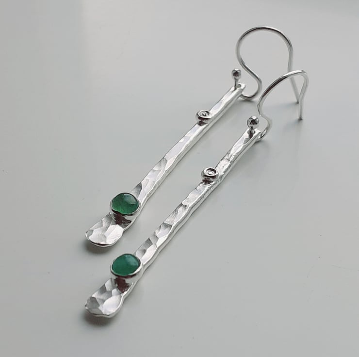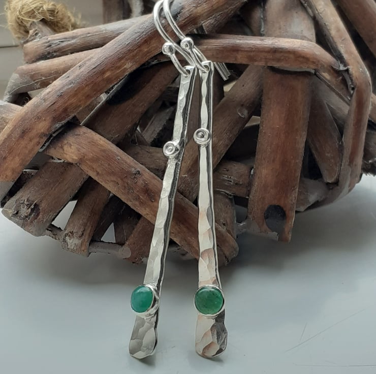These earrings are made from sterling silver 2 mm wire hammered flatish then textured, wire brushed and tumbled for strength and shine. I have set the emeralds gemstones near the bottom of the earrings the emeralds are natural and slightly mis-shaped approx 3.5 mm every emerald will be different.