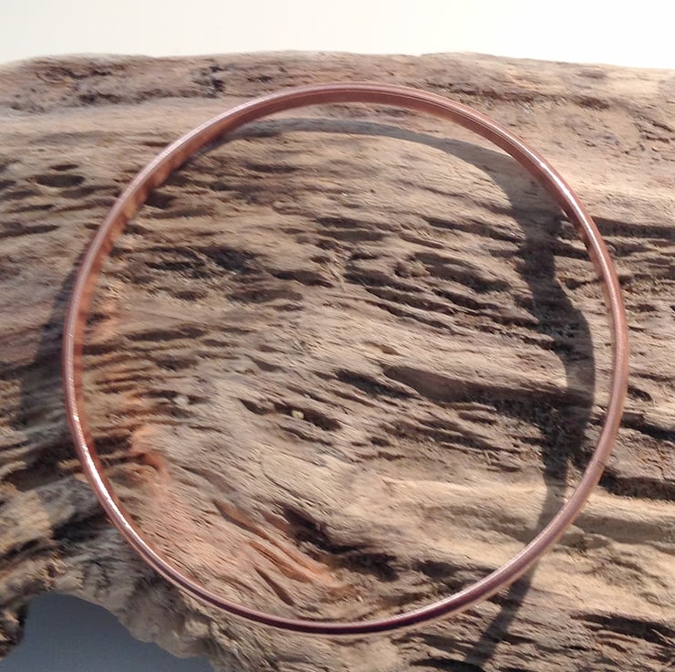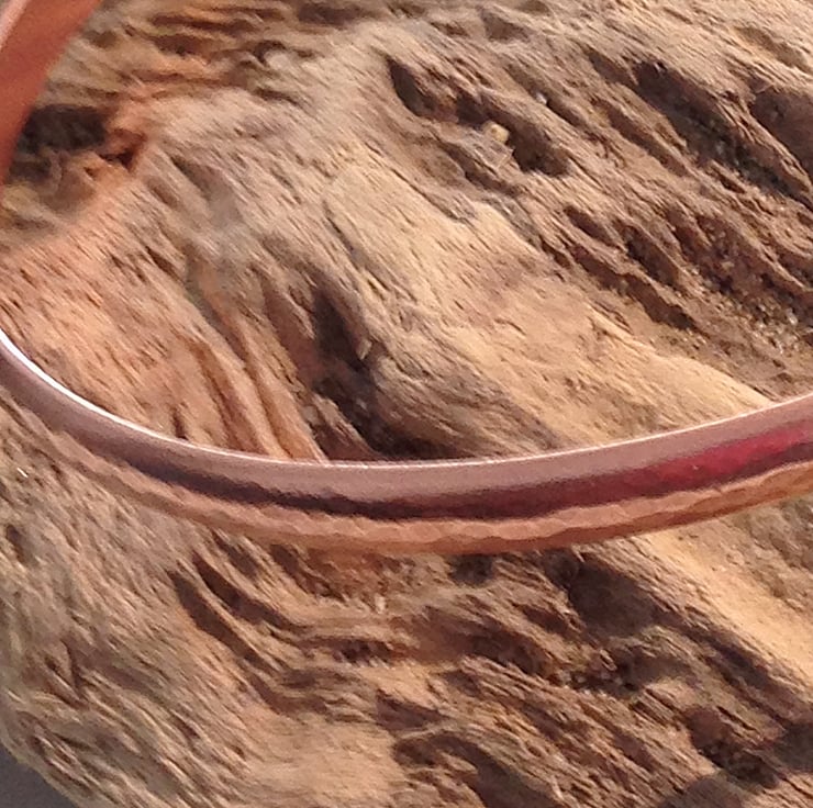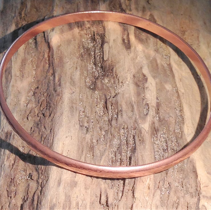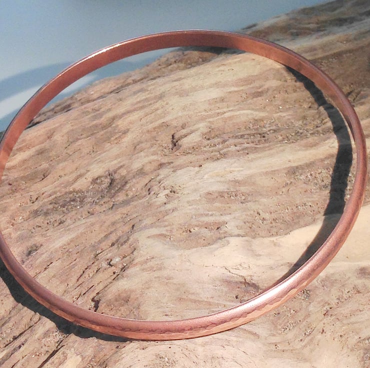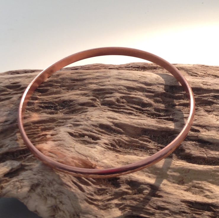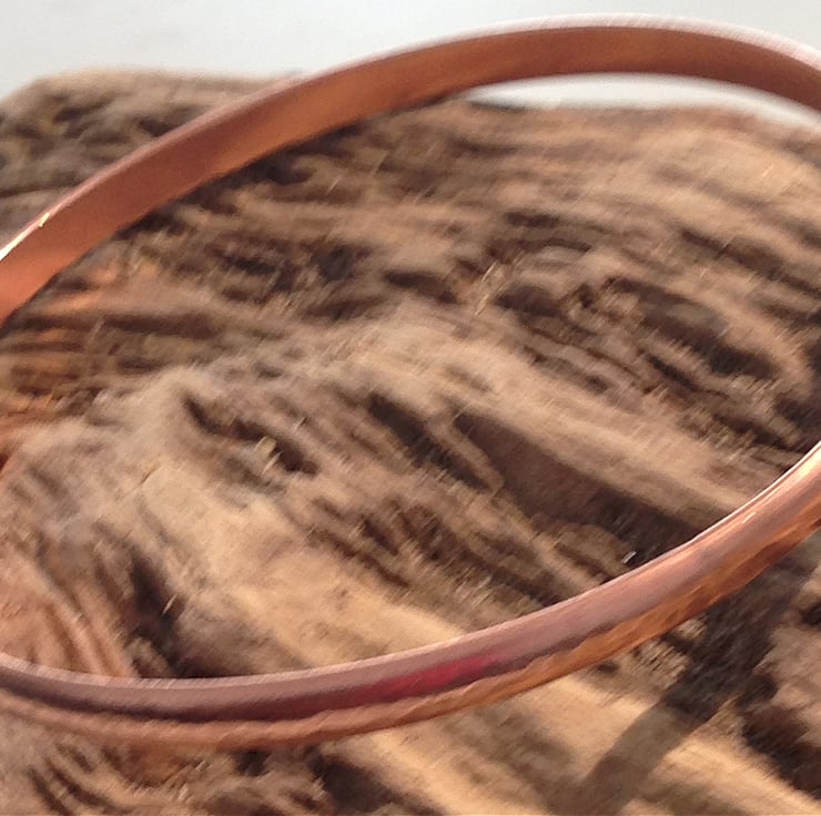 This copper bangle has been handcrafted from 5 mm wide D Shaped copper in a 2 mm thickness. It has been given an attractive hammered finish and polished.