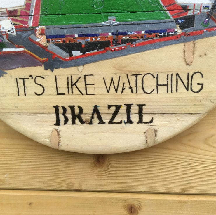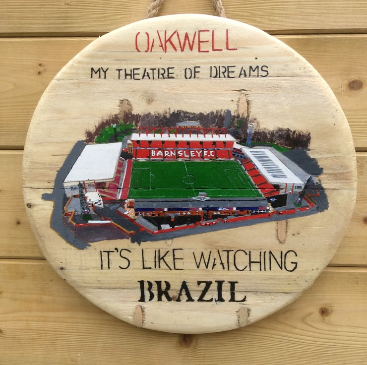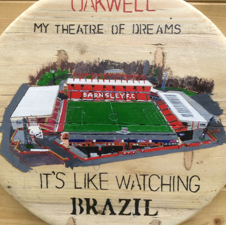 A painting of Oakwell is accompanied with the following text : OAKWELL MY THEATRE OF DREAMS IT’S LIKE WATCHING BRAZIL