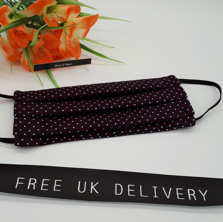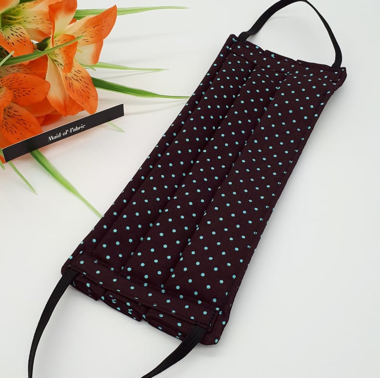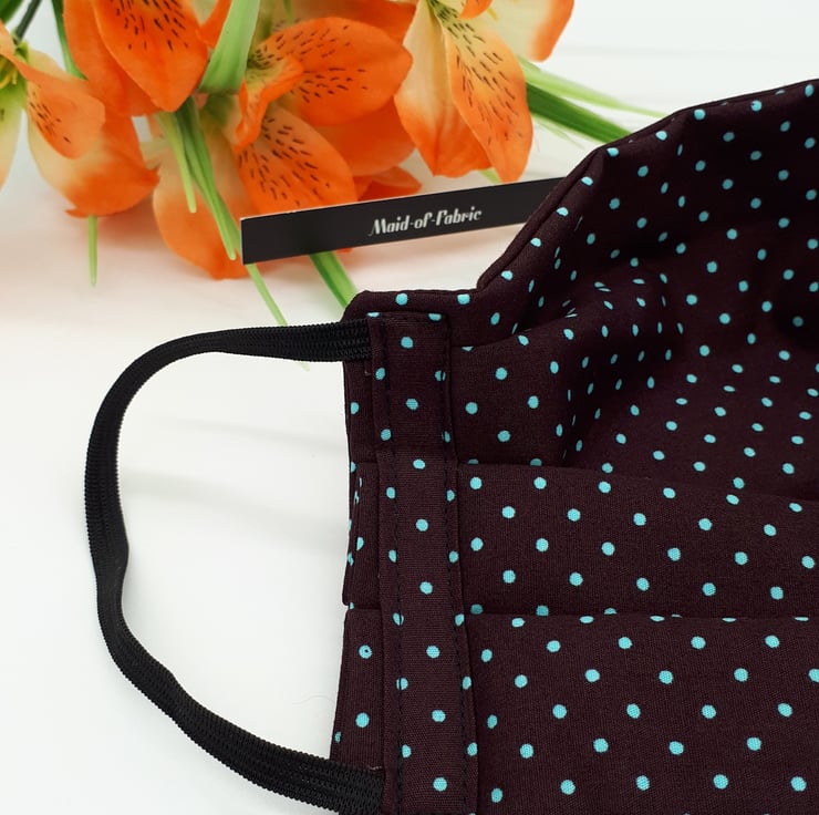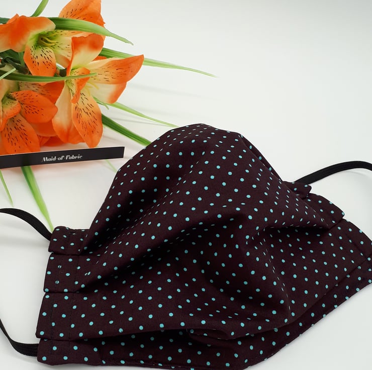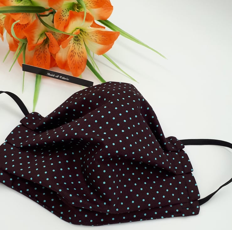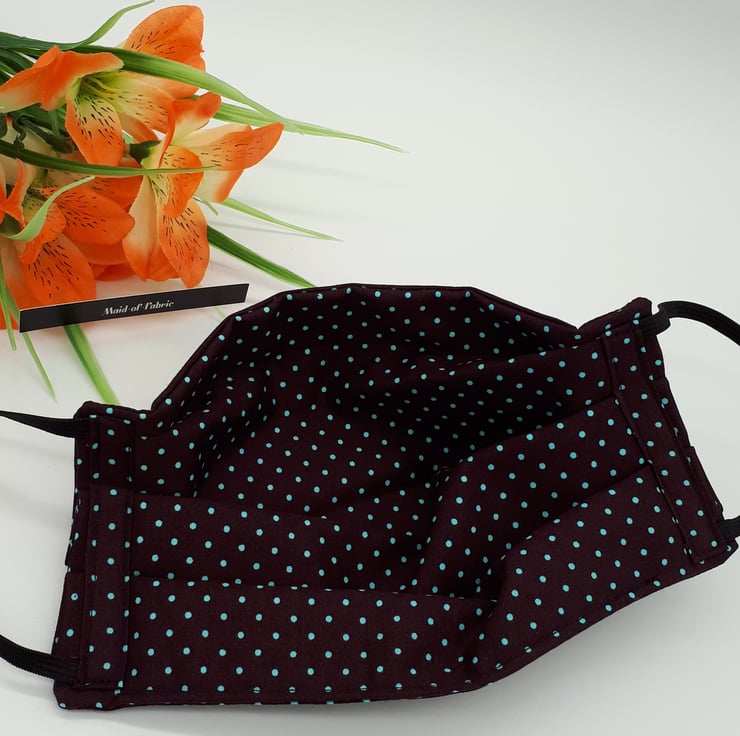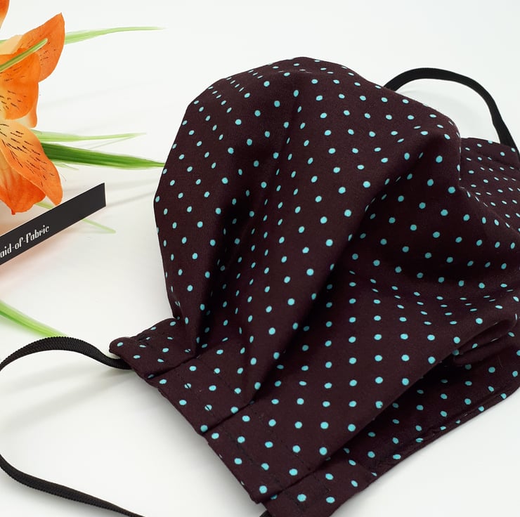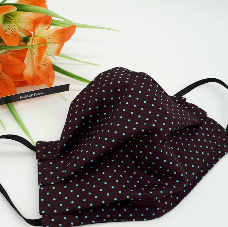 Face mask made using chocolate and turquoise polkadot cotton fabric and black elastic.
