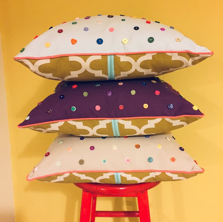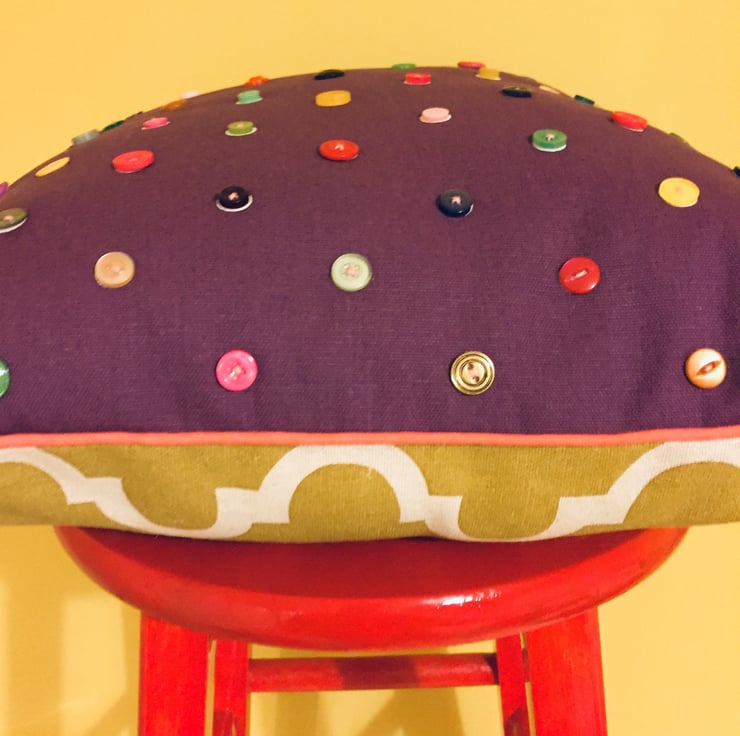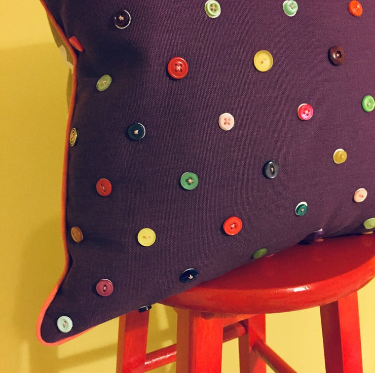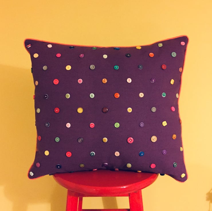 Purple polka dot cushion covered in multicoloured new and vintage buttons, all hand stitched so very secure.
