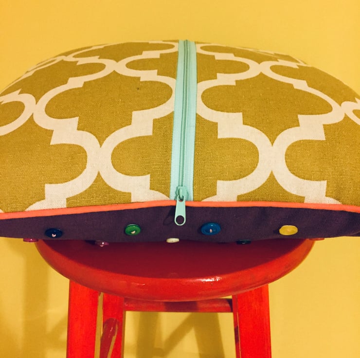 Pinky coral piping around the outside, a patterned mustard backing and contrasting zip opening at back of cushion.