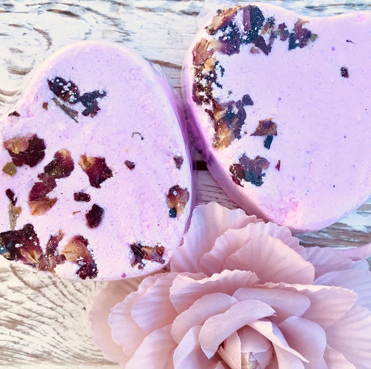 Our Elegance Heart Bath Bomb with Dried Rose Petals and Shea Butter is bursting with exotic aroma, floral and sweet at the same time with an uplifting fragrance.
