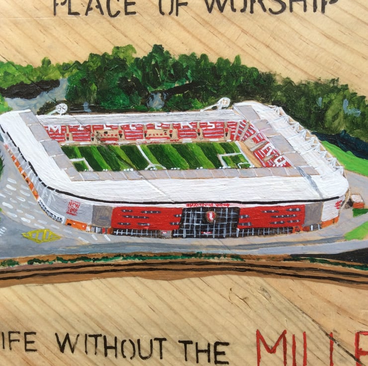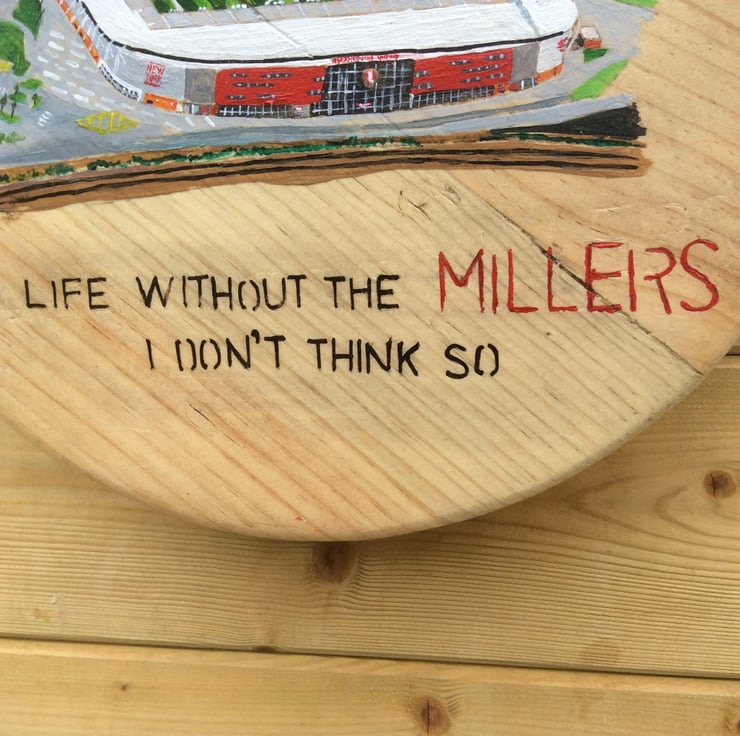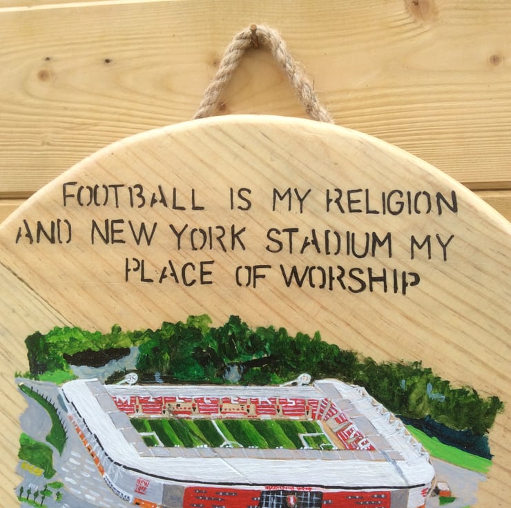 The New York Stadium is depicted and around it the following text: FOOTBALL IS MY RELIGION AND NEW YORK STADIUM MY PLACE OF WORSHIP. - LIFE WITHOUT THE MILLERS I DON’T THINK SO.