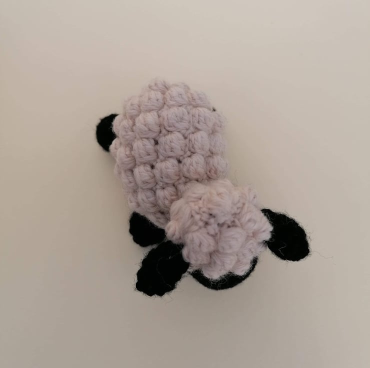 The lamb measures 9.5cm long, 6.5cm wide, and about 7.5cm tall. She is made from 100% wool yarn and stuffed with 100% wool stuffing. Her eyes are embroidered with wool yarn.