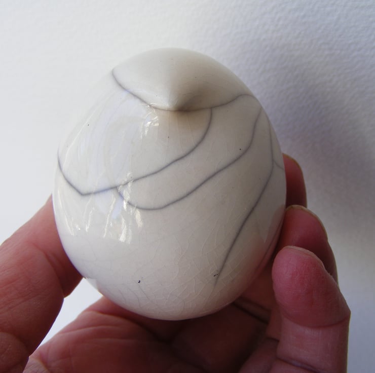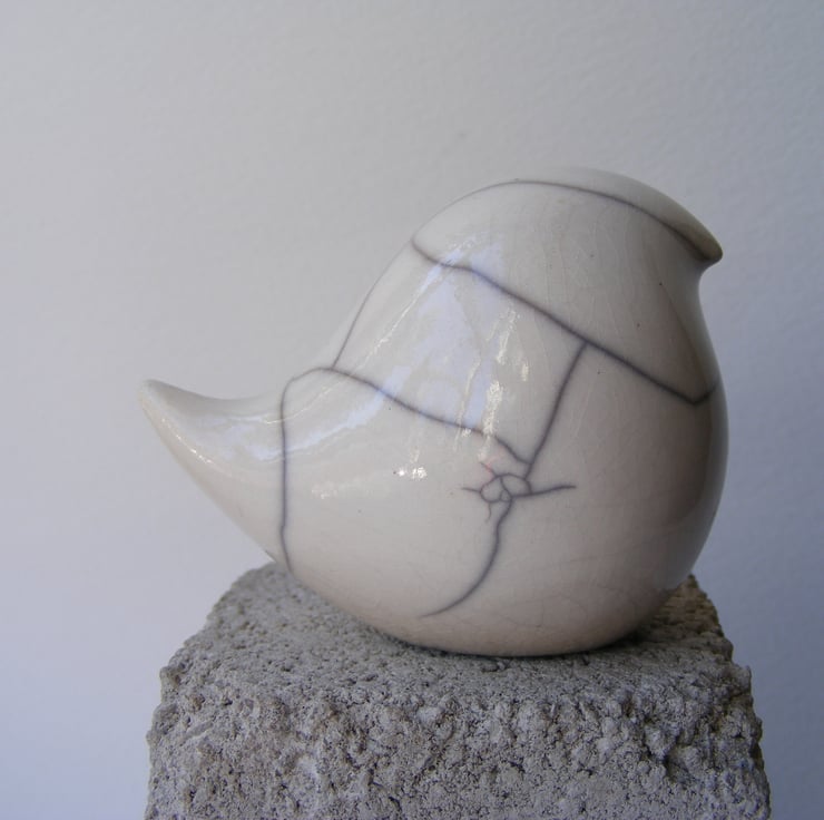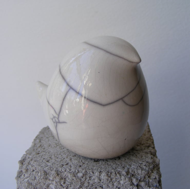 This bird is hand made and measures, approx 5cm high and 6.8cm long. It is made from white earthenware clay and fired first in an electric kiln then four layers of clear glaze is painted on and it is then raku fired in a gas kiln and then smoked in a bucket of sawdust which highlights the crazing.