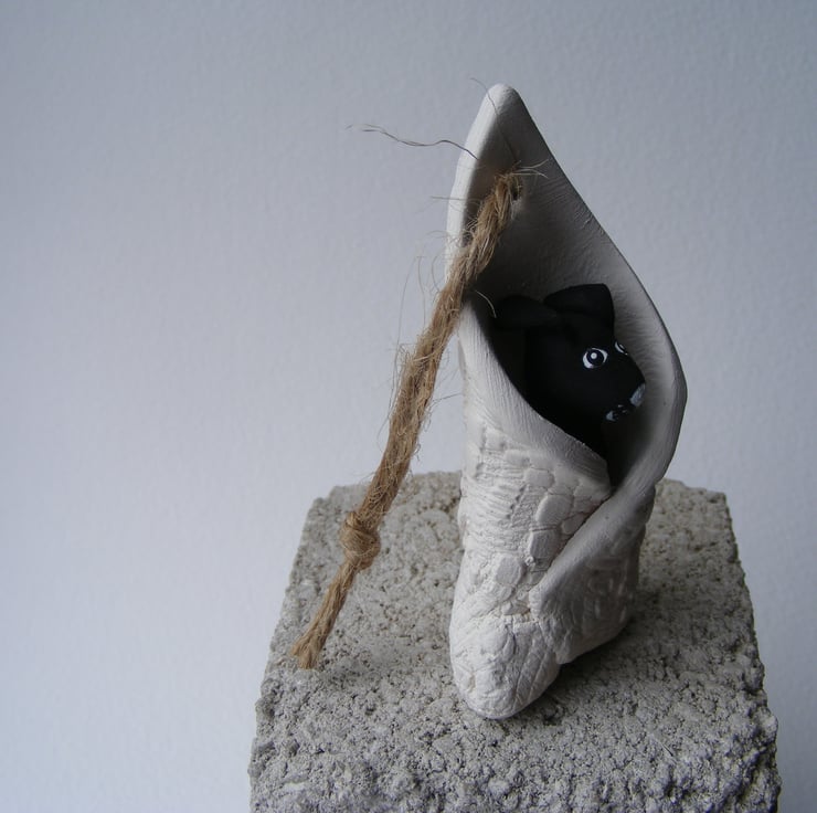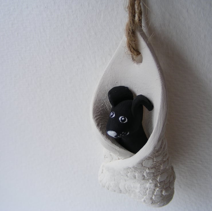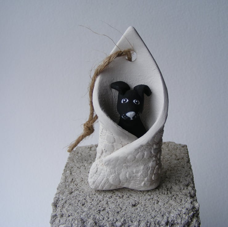 This little dog has been wrapped up in a blanket, all nice and cosy. It measures approx 6.5 cm long and 3.5cm wide. It is made of white earthenware clay, I modelled the dog first then rolled out a piece of clay and impressed a piece of lace in to it, I then wrapped the dog up, used a drill to make the hole for the string to hang it up, it does stand alone. After firing I painted the dog with acrylic paints