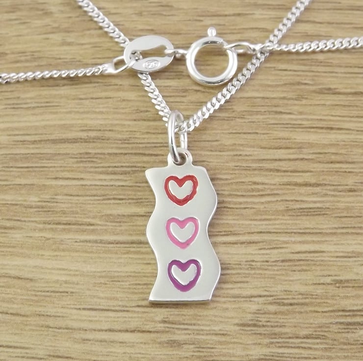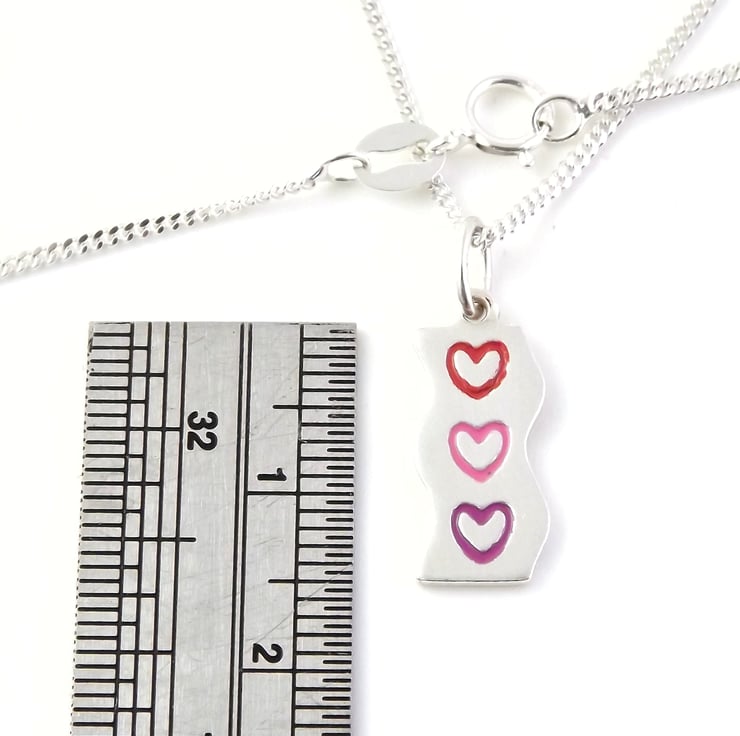 This small wave heart pendant has been lovingly handcrafted in the UK. It is made from recycled sterling silver sheet and is etched before being drilled and cut out by hand, the edges are then smoothed using files and emery paper. A jump ring is then attached and soldered on. Coloured resin based enamels are added to the etched hearts and then the piece is then polished.