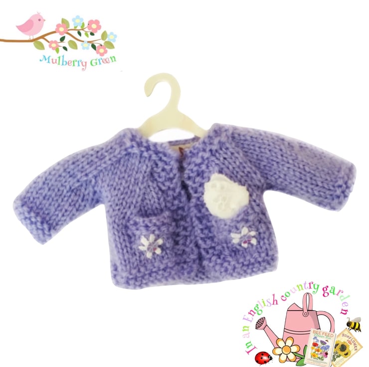 A sweet little lavender cardigan with two tiny pockets trimmed with daisies and sequins, to fit the Mulberry Green characters. In one of the pockets there is a little handkerchief to wipe those tiny Mulberry Green noses. The cardigan is hand knitted and comes on a cute little wooden hanger. It matches the lavender dresses.