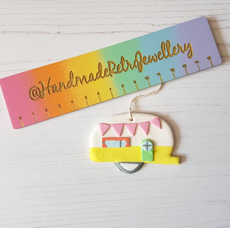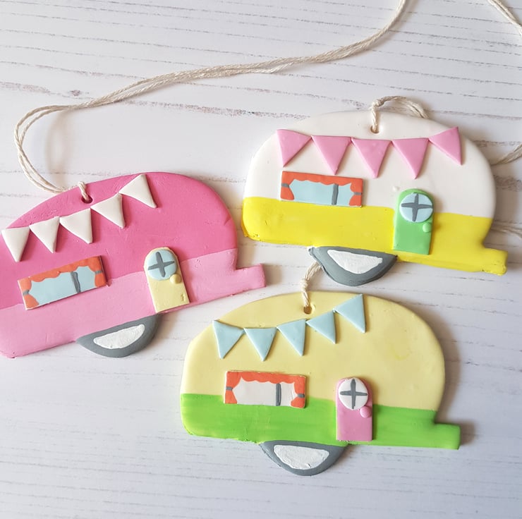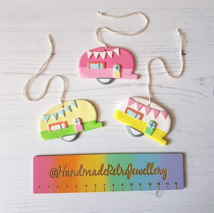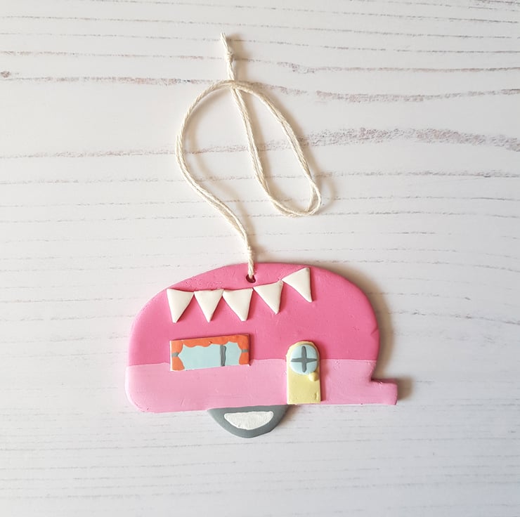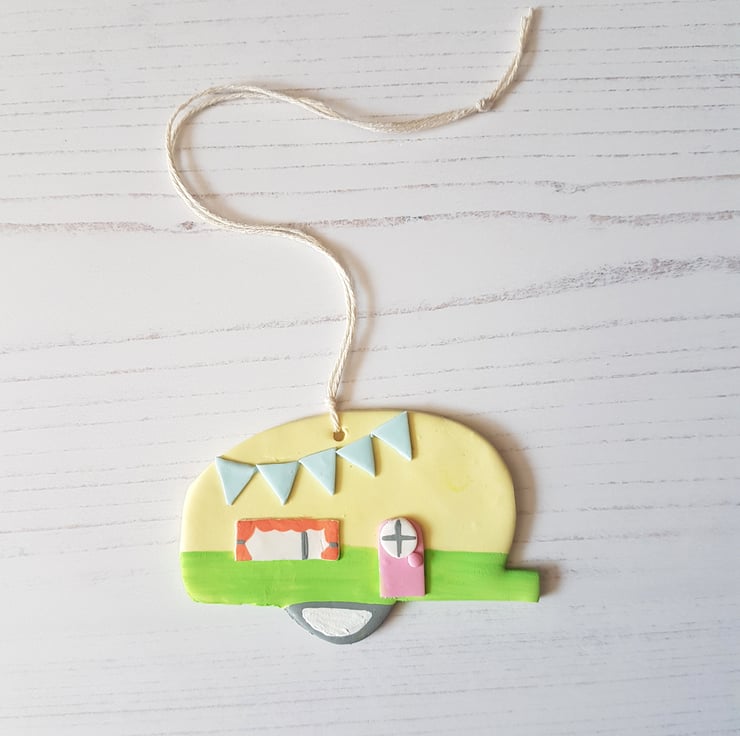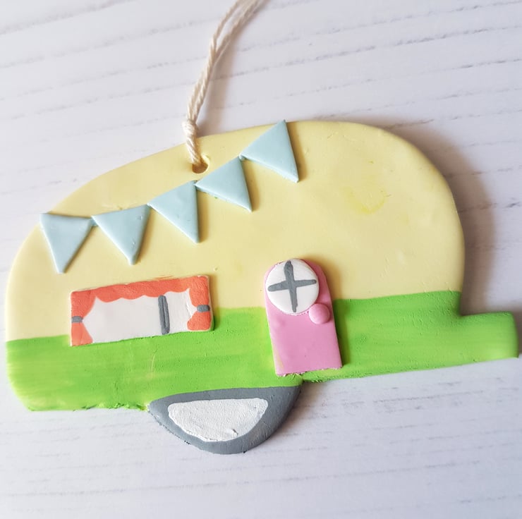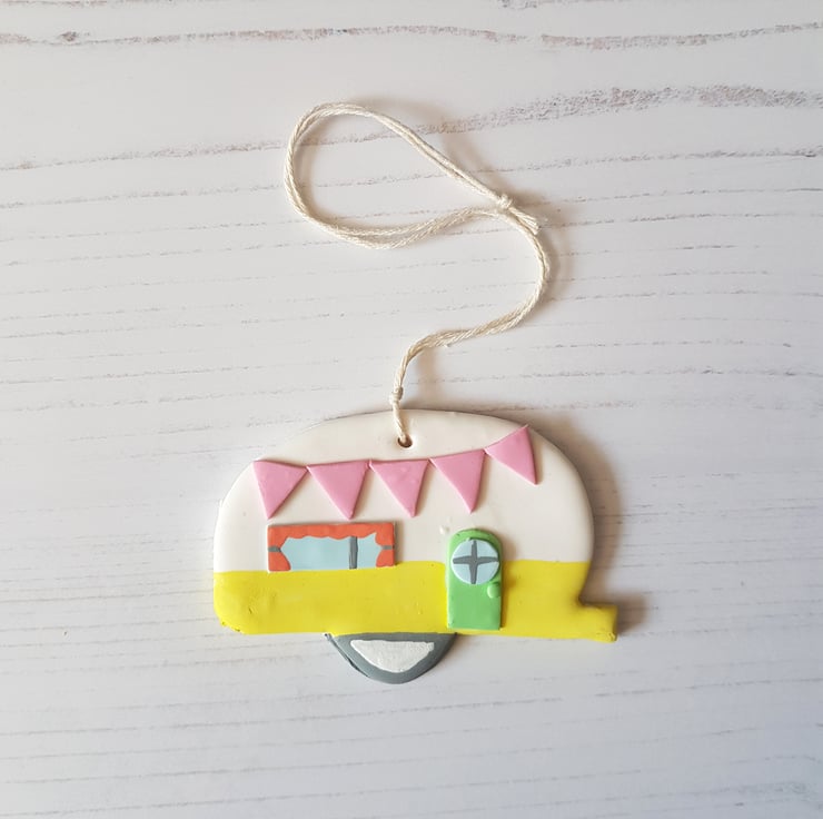 This cute caravan decoration is made of polymer clay, with detail hand painted using acrylic paint to finish. Complete with curtains and bunting, it looks so twee and cosy!
