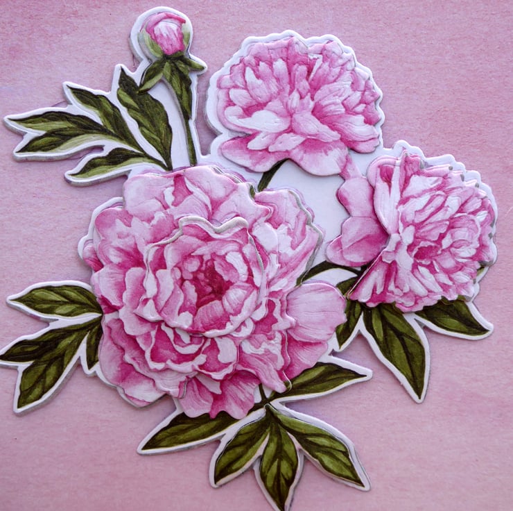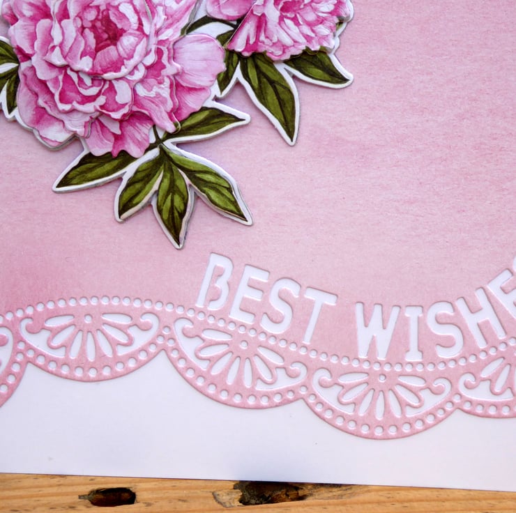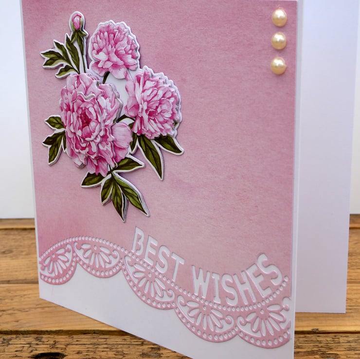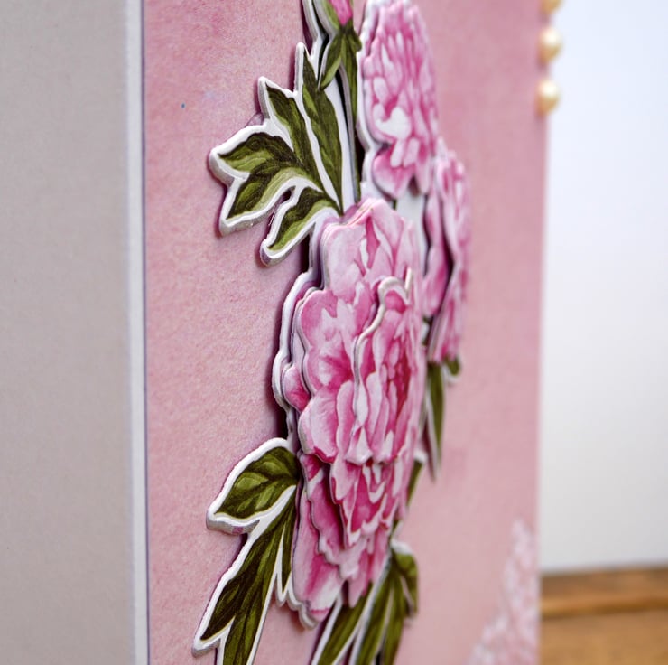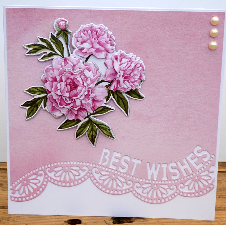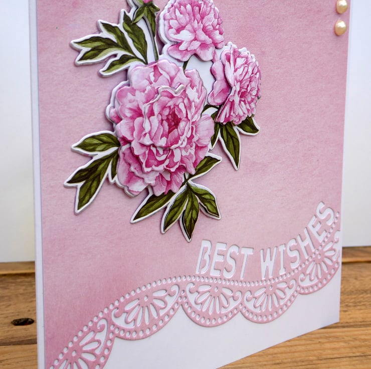 This 300gsm card has some lovely decoupage peony blooms on the front,together with some pearls. Using some pink card die-cut a pretty border together with the sentiment.
