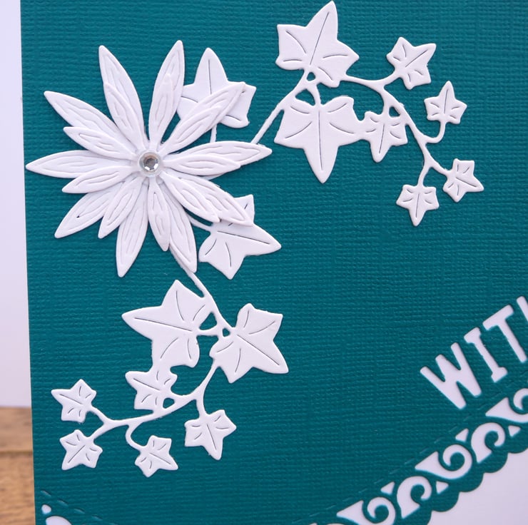 Made up this 300 gsm white card blank and die cut a sentiment with border and attached to the front. Die-cut a flower, leaves and butterfly and added these together with some gems. Can be used for a number of occasions.