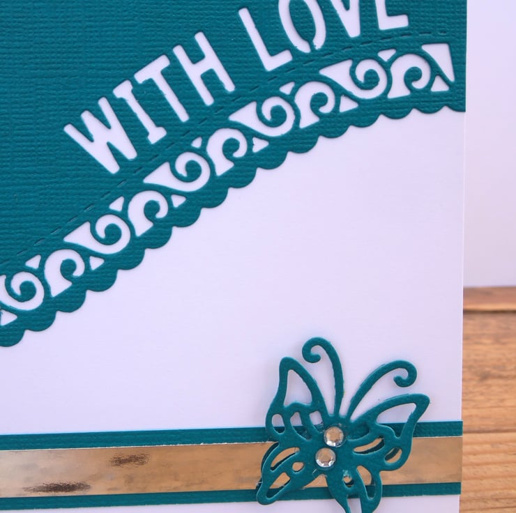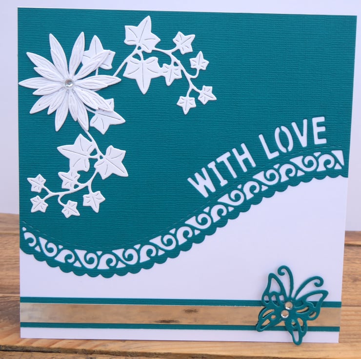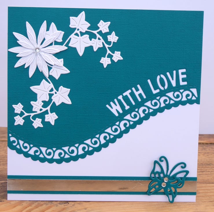 Made up this 300 gsm white card blank and die cut a sentiment with border and attached to the front. Die-cut a flower, leaves and butterfly and added these together with some gems. Can be used for a number of occasions.