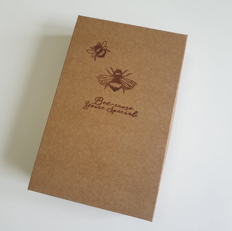 Your gift will arrive wrapped in tissue inside a handmade box, stamped with bees and a message on the top.