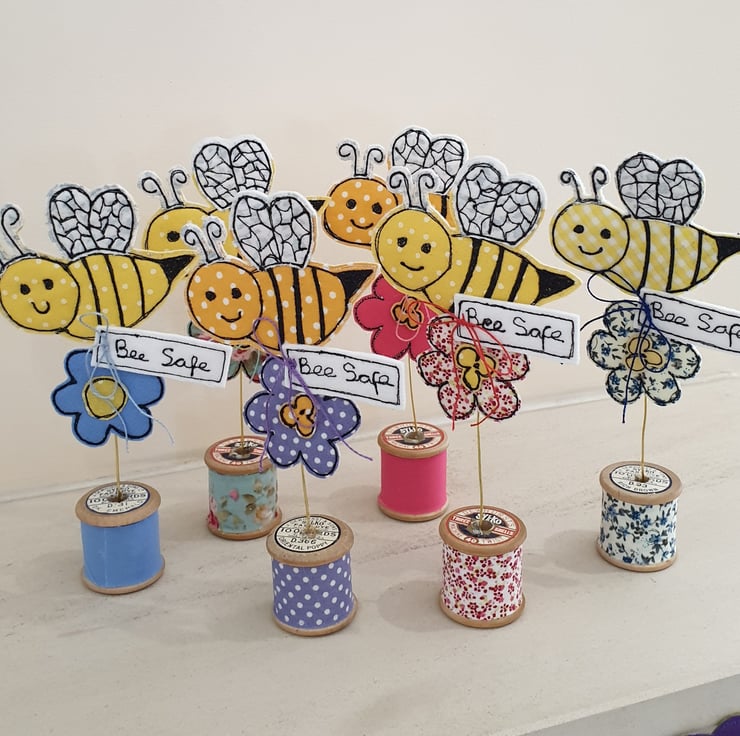 The bee and flower are created using 100% cotton fabric and wool mix felt, individually stitched using free motion machine embroidery and then cut out by hand with a pair of very sharp scissors.
