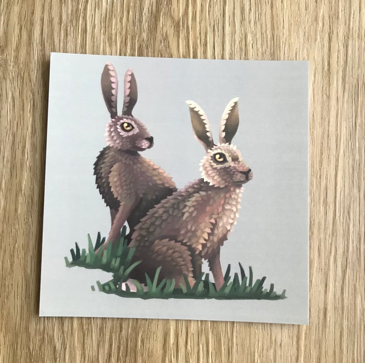 A Hares square post card by DuffleCat Prints (Damian Case). Front of card with design on is matt coated. Back of card is blank and uncoated for your message. Postcard is 120mm x 120mm, 330gsm card stock. Portrait.