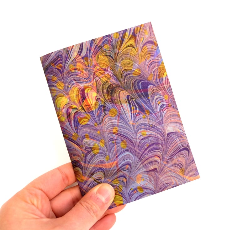 Marbled three times, there is blue, purple and yellow underneath a metallic gold and purple Serpentine pattern on the outside cover and the inside of this little notebook contains 140gsm artist quality acid free recycled coffee cup paper made by the brilliant James Cropper Plc in Britain. As the paper is recycled, it is off white and has small darker flecks in it.The blue card that makes up the rest of the cover is also from their CupCycling program.