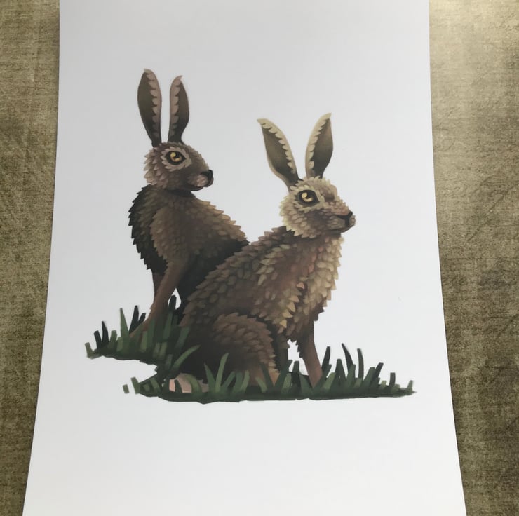 A hares post card by DuffleCat Prints (Artist Damian Case). Front of card with design on is gloss coated. Back of card is blank and uncoated for your message. 127mm x 177.8mm. 330gsm card stock. Portrait.