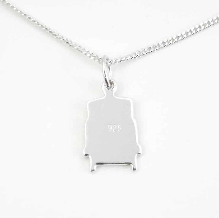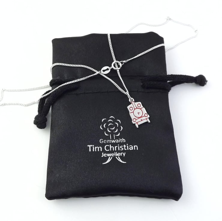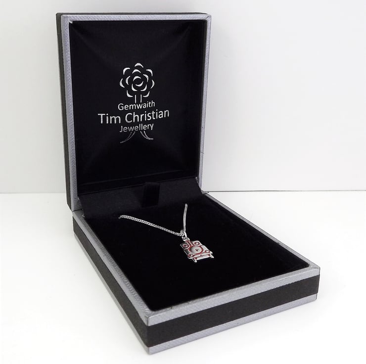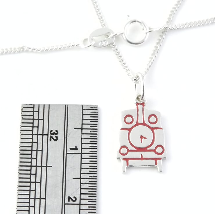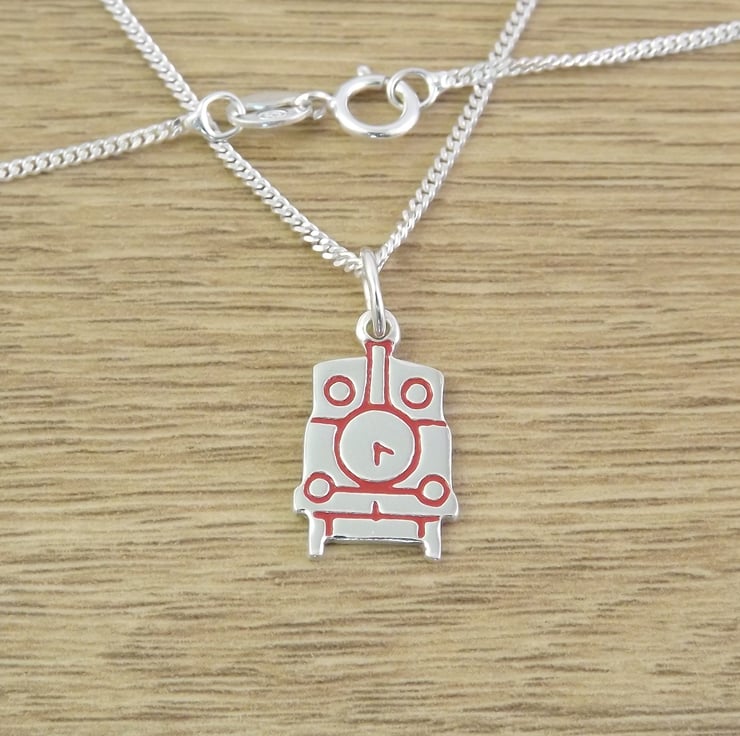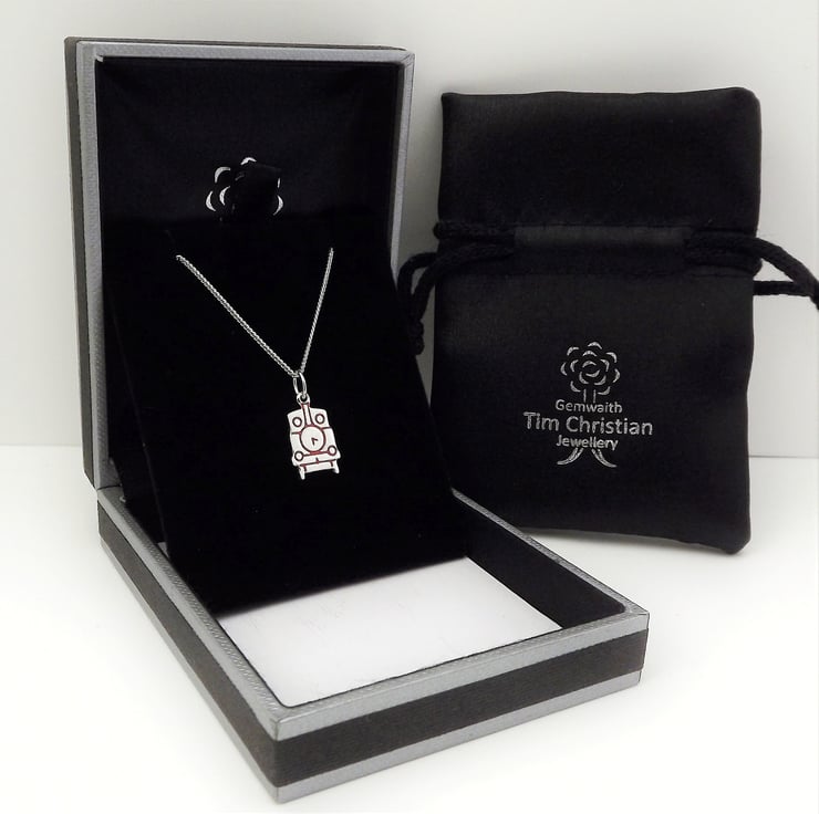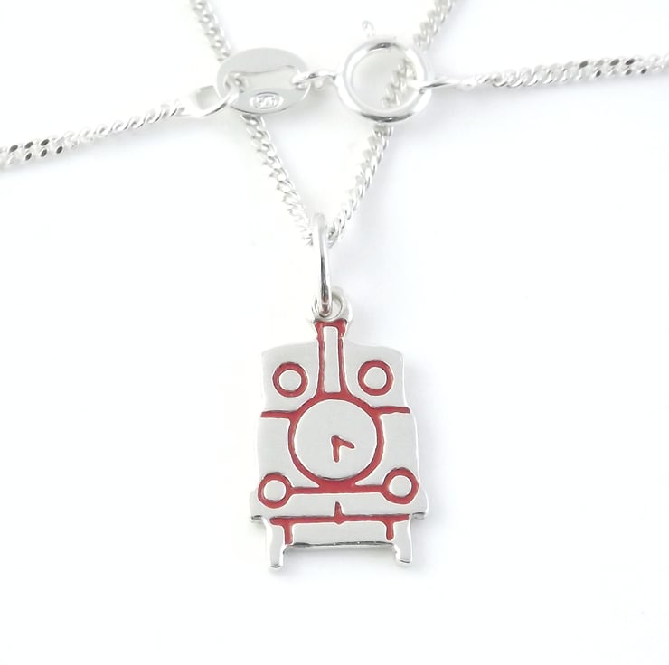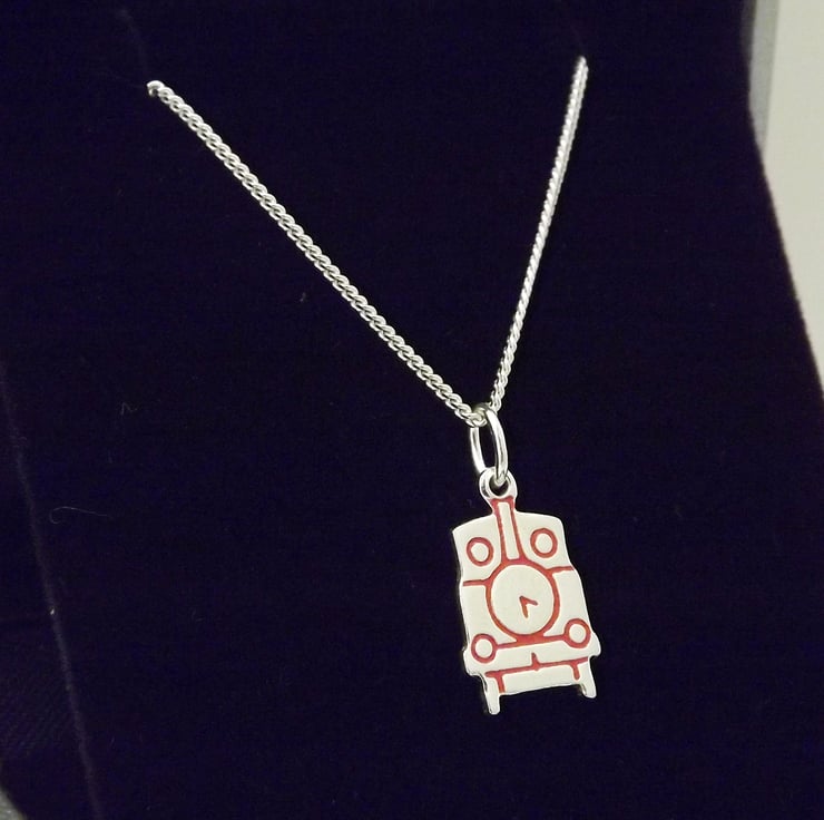 This silver pendant features an image of a steam locomotive and has been lovingly handmade in North Wales. It is crafted from sterling silver sheet and is etched before being cut by hand, the edges are then smoothed using files and emery paper. A 5mm oval jump ring is then attached. A black, blue, green or red resin based enamel is added to the etched areas and then the piece is polished before being attached to a chain.