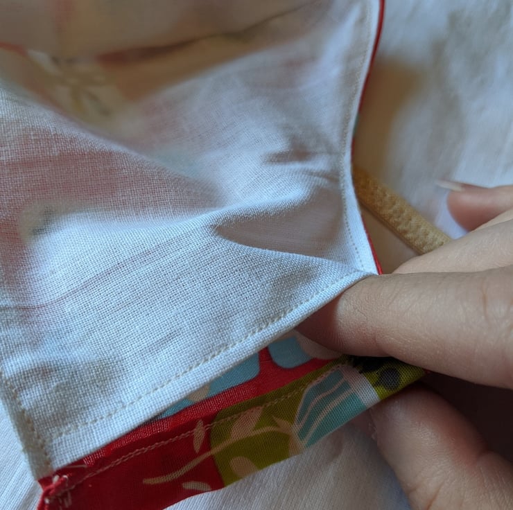 The elastic used is foldover elastic of the type used in lingerie, which is more comfortable than standard elastic. The mask arrives with elastic ties undone so the wearer can tie them at the most comfortable and best-fitting length. There is a pocket at the back of the mask for the user to insert a filter (see photograph).