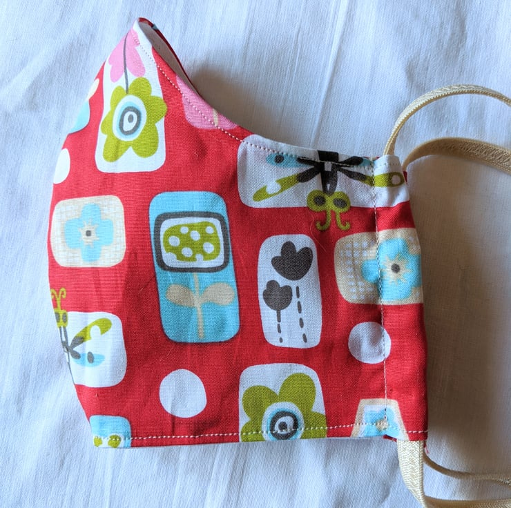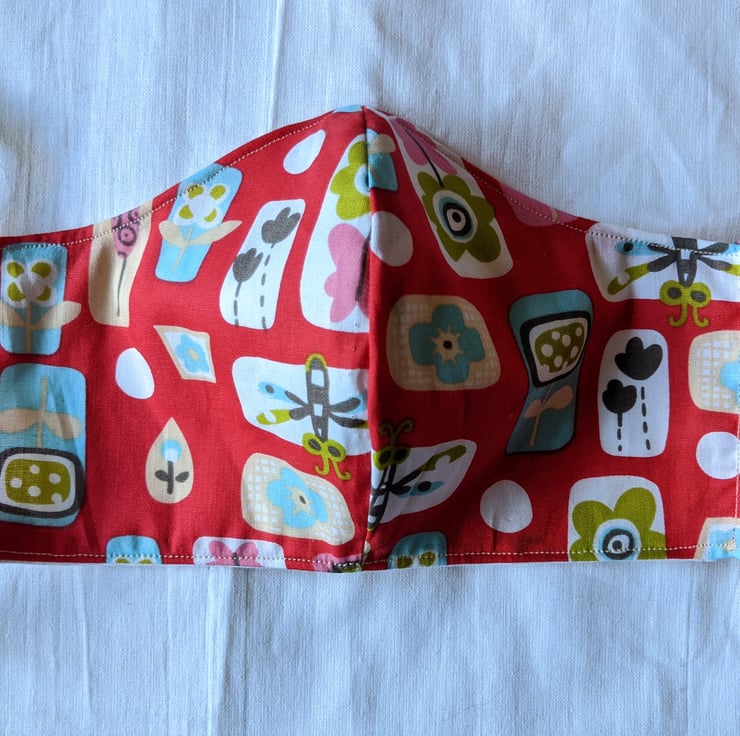 This is a face mask with elastic ties. The mask is made of 100% cotton lightweight broadcloth with a pattern of flowers and insects in a modern style. The pattern simultaneously faces two directions, so elements on each mask are right side up and other elements are upside down.