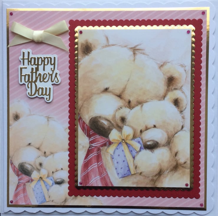 This is a lovely luxury 3D handmade greeting card to say Happy Father's Day. The design is a really cute daddy teddy bear wearing a red stripy tie cuddling his child who is giving him a nicely wrapped gift. The 3D greeting has been gold foiled and says "Happy Father's Day". The elements on the card have been hand cut by me and the card has been finished with gems and a matching ribbon bow.