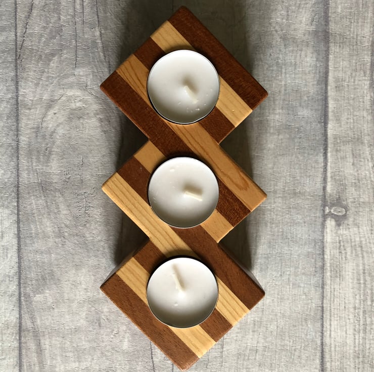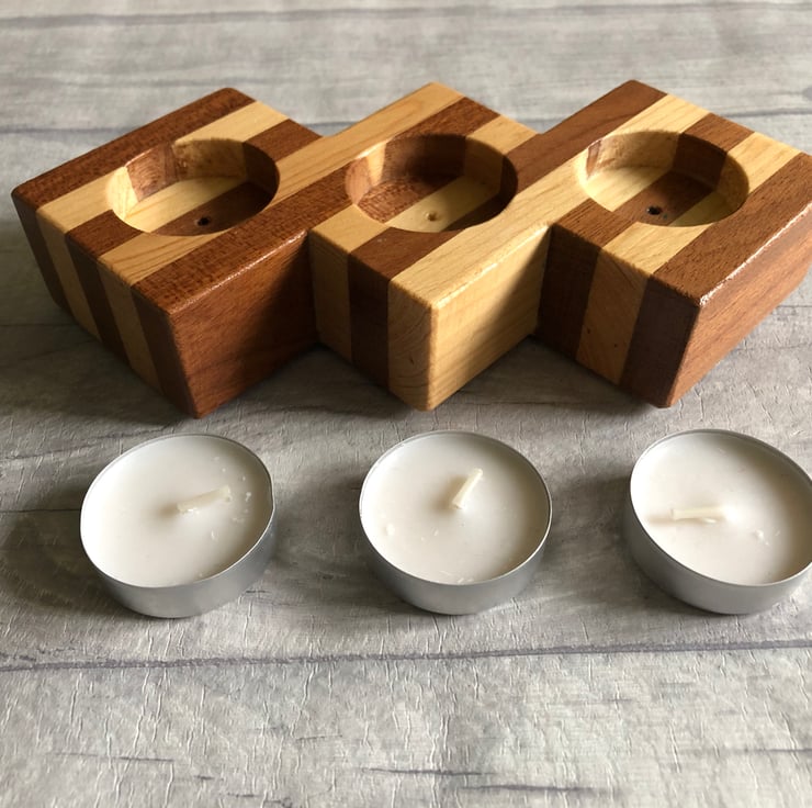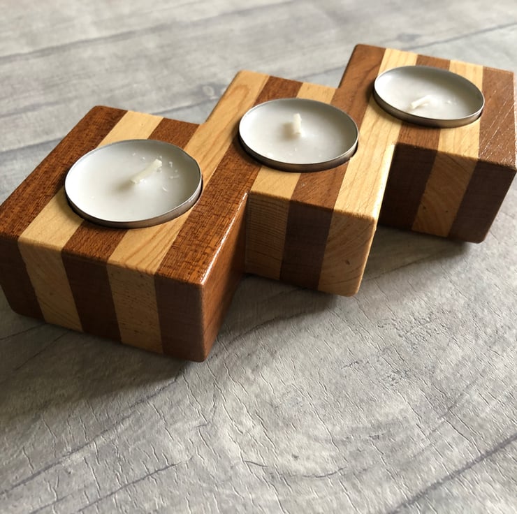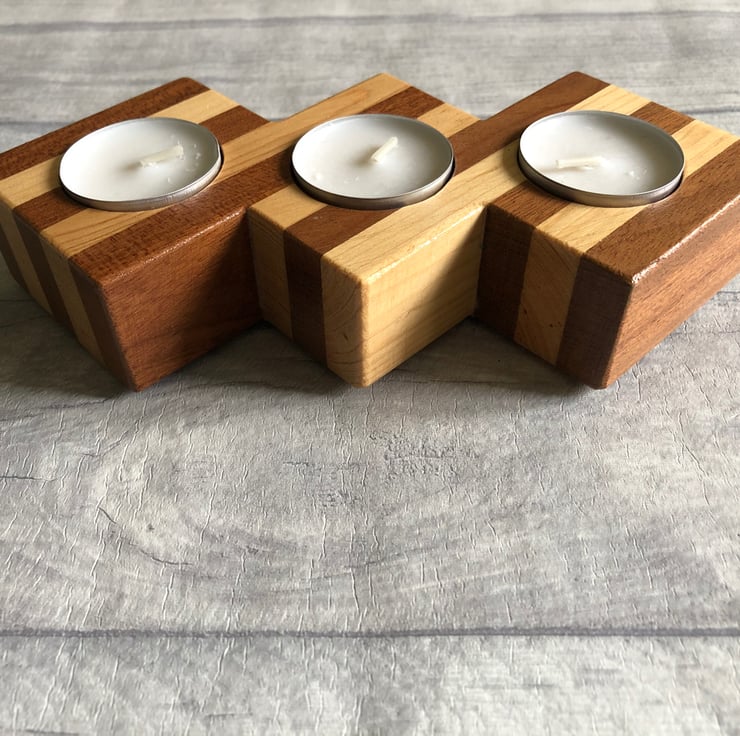 Hello, here we have our handcrafted wooden triple tea light holder, candleholder. The tea light holder is made using recycled wood and are all unique.