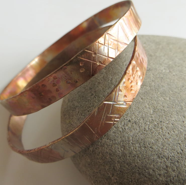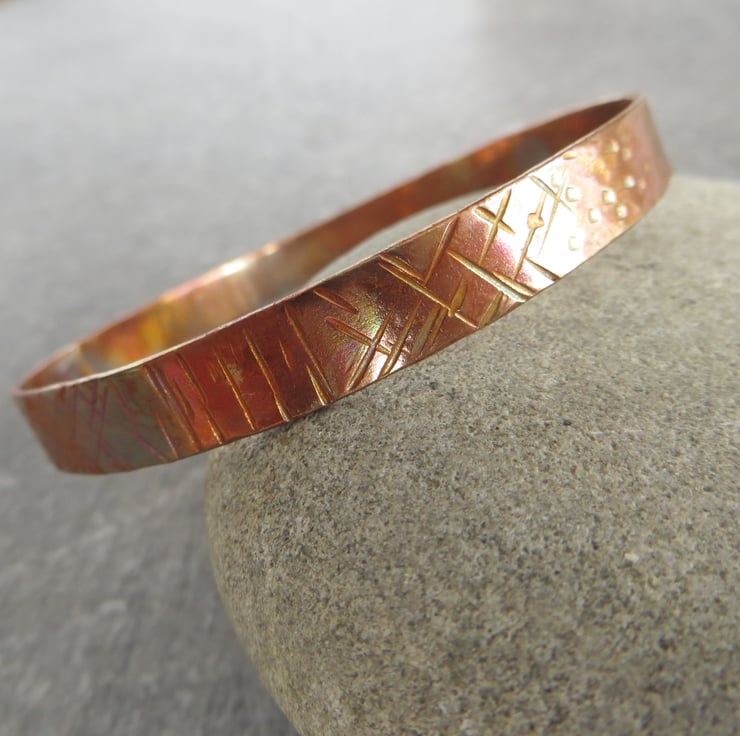 It's made from solid copper sheet which I've textured with a variety of hammer strokes, soldered together and smoothed at the edges before giving it the wonderful patina with a heat gun. This is quite an unpredictable process and each bangle will vary as to which colours will come out on which part of the bracelet.