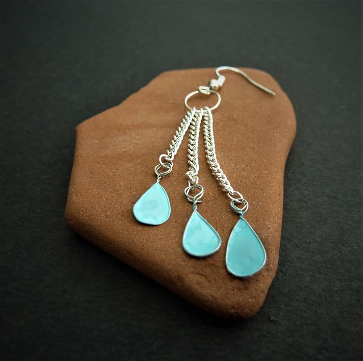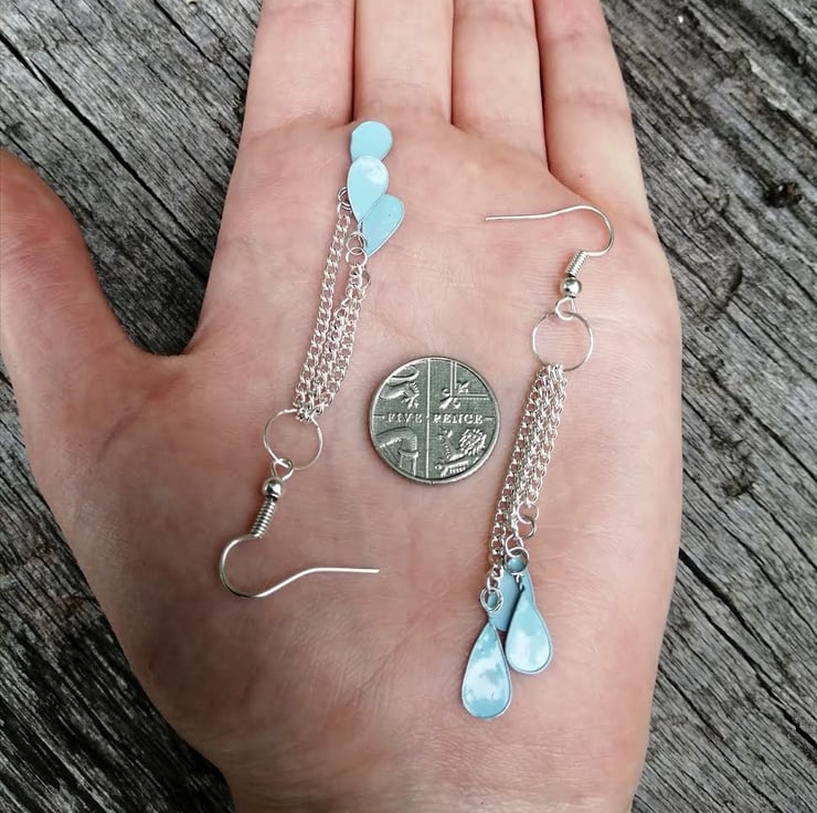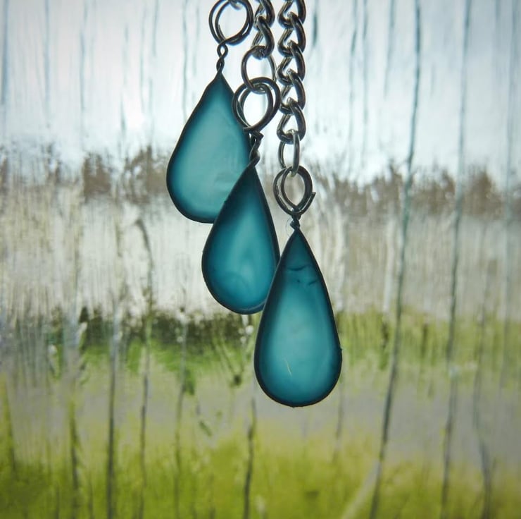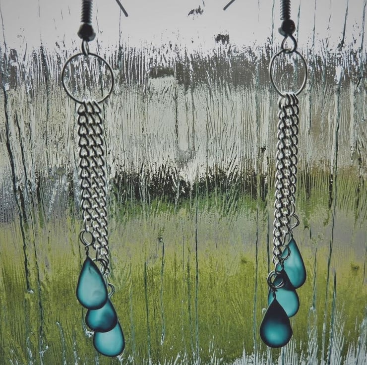 Unusually, the raindrops are made using nail polish and wire, which, because of the lovely blue colour, creates a gorgeous stained glass effect when the earrings are against the light. I also love how the drops swing gracefully as you move because they are hung from chains.