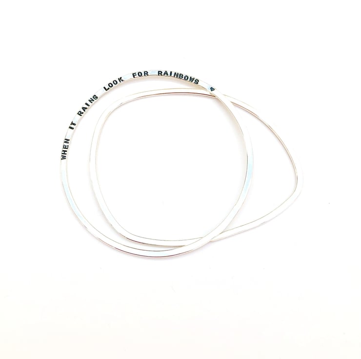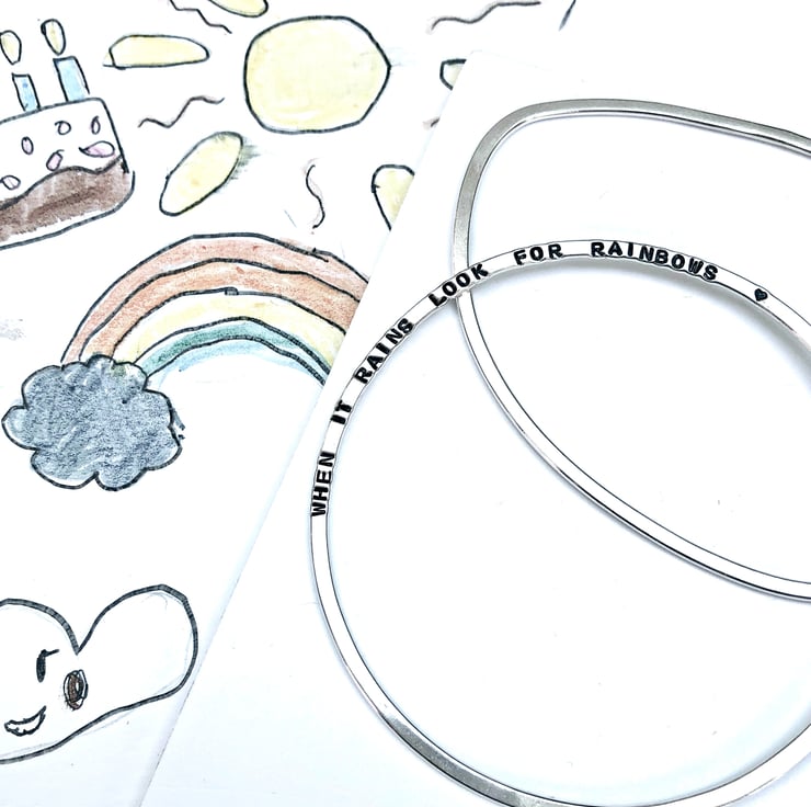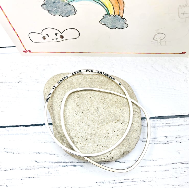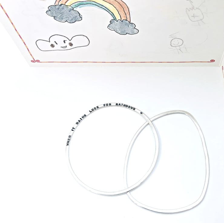 The recommended quote to be carried on these bangles is "WHEN IT RAINS LOOK FOR RAINBOWS", which is taken from a quote by Oscar Wilde:-