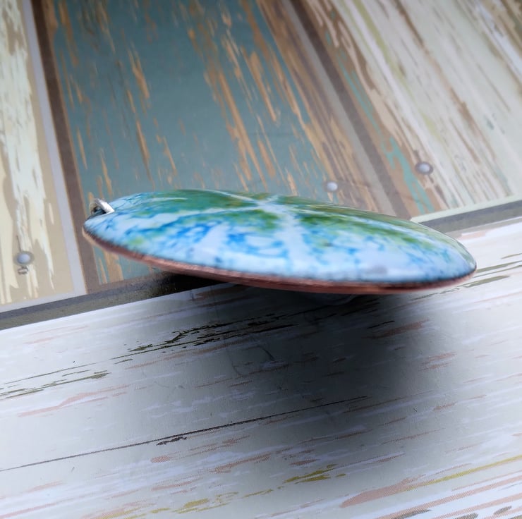Several coats of opaque and transparent enamel have combined to create this lovely piece. I have used lavender blue as a base and added Genoa blue and lime green transparent enamels over the top, scraping them away to create a starburst design. This has created a crackle design under a smooth, ultra glossy surface, with a unique shading effect. I will definitely be returning to this technique and colour palette.
