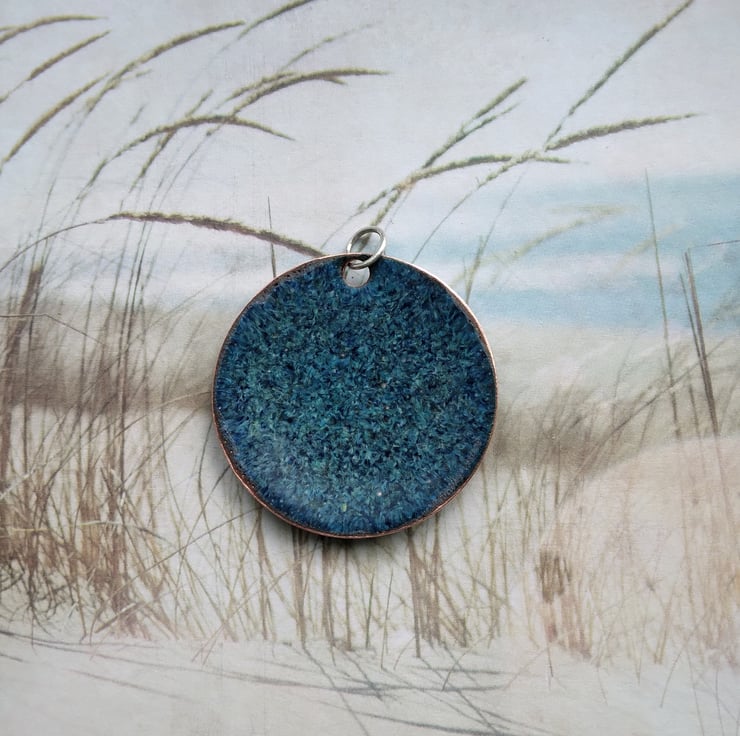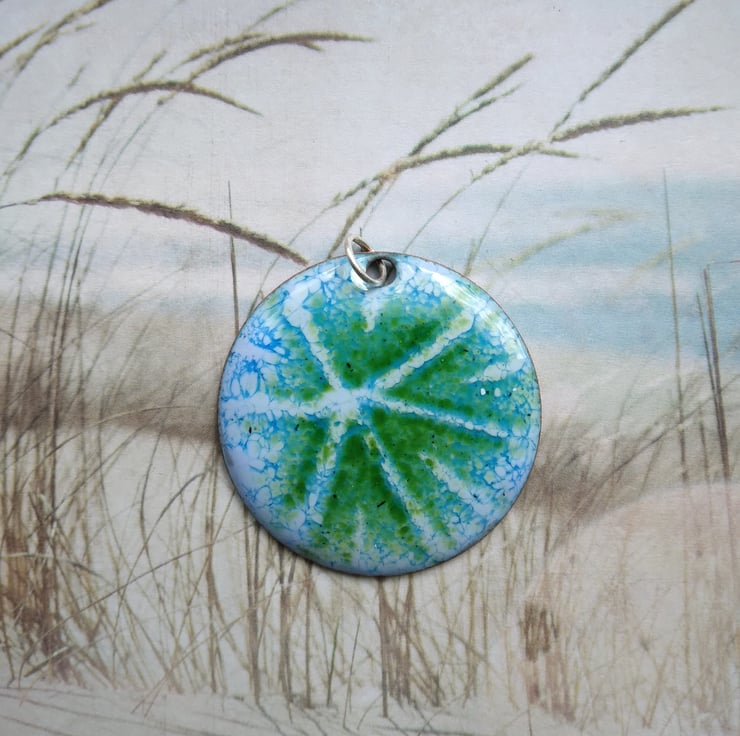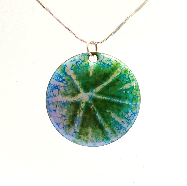Round, domed enamelled copper pendant in shades of blue and green with a starburst design. The pendant has been kiln-fired and measures approximately 30mm in diameter. To complete the piece aesthetically and for a smooth finish against the skin, the back has been given two coats of dark blue tweed-effect enamel. It comes complete with a soldered sterling silver jump ring (6mm) and is supplied with an 18" silver plated snake chain and a little organza pouch.